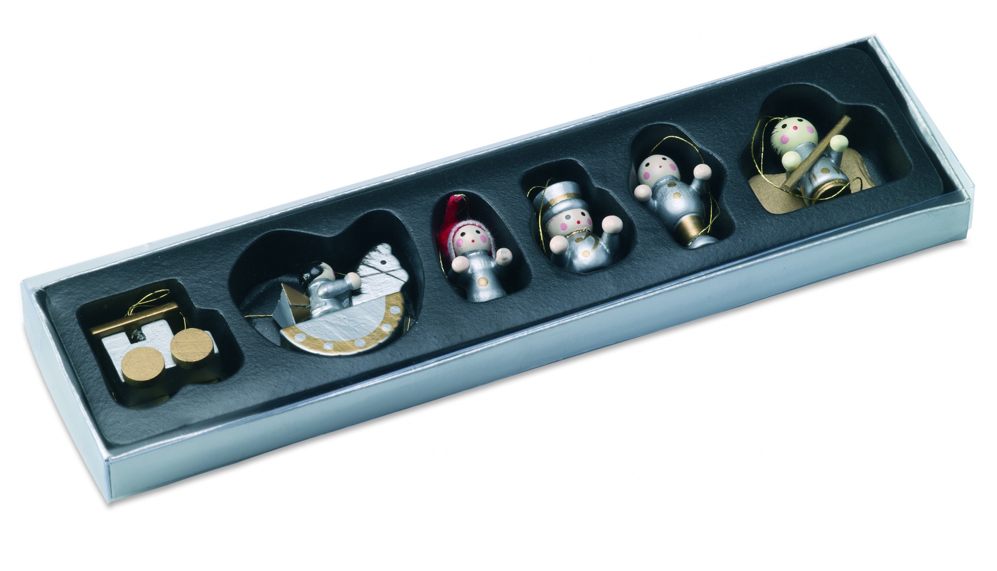 Set of 6 wooden Christmas tree hangers presented in a cardboard box with clear lid.
