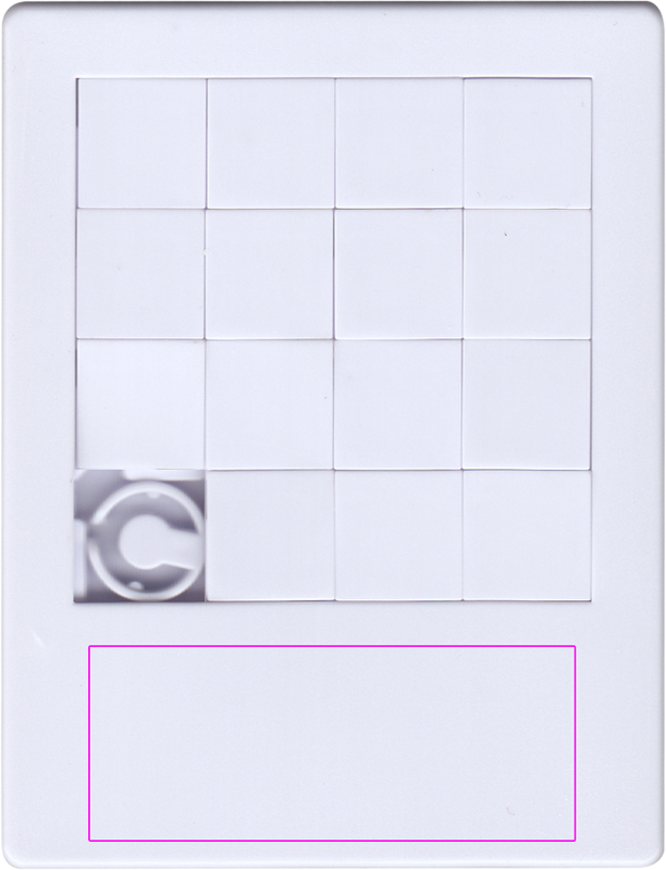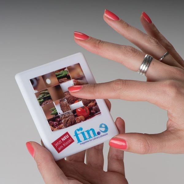 Plastic sliding puzzle game with 15 pieces and a stopper. We will print your logo allover with digital print.