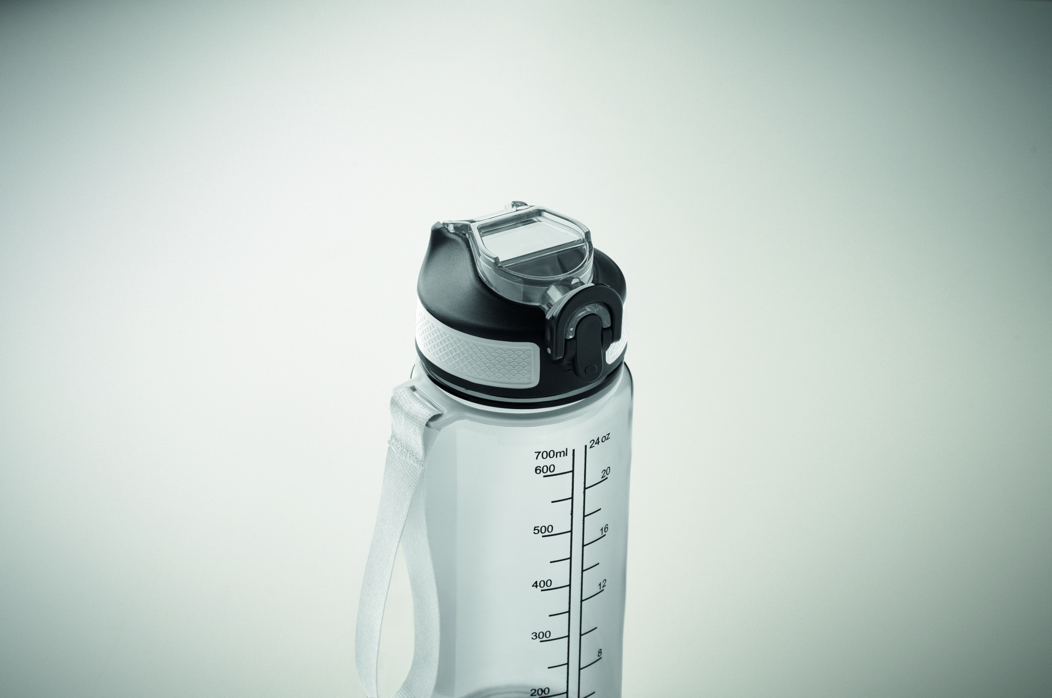 Motivational sports water bottle in RPET with integrated straw, soft silicone mouth piece, one hand opening flip top lid, safety lock. With carrying strap in RPET satin. Capacity 700 ml. Leak free.