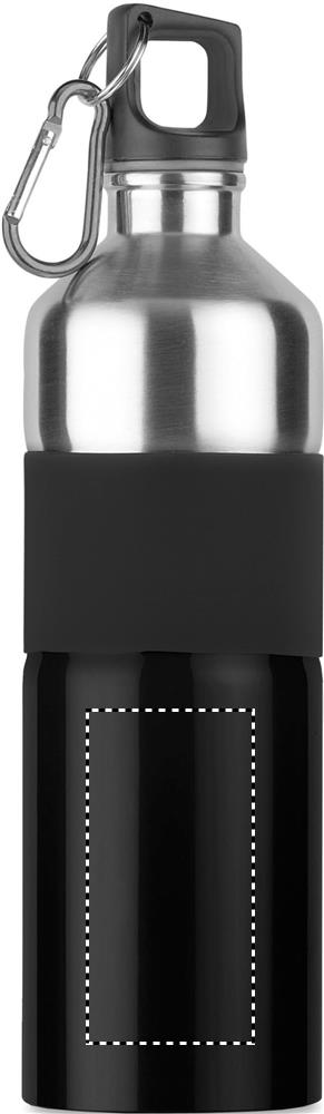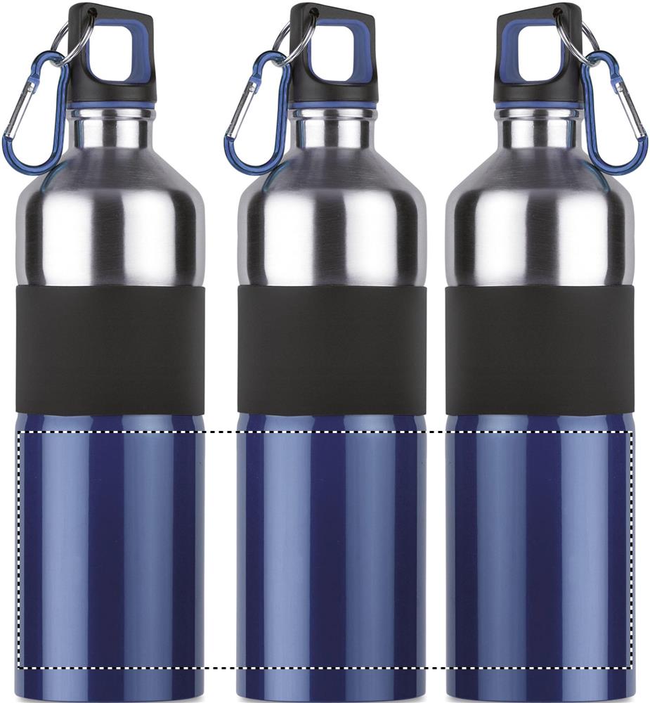 Single wall bicolour stainless steel bottle with rubber grip and carabiner hook. Capacity: 750 ml. The carabiner is not for climbing (non professional use). Leak free.