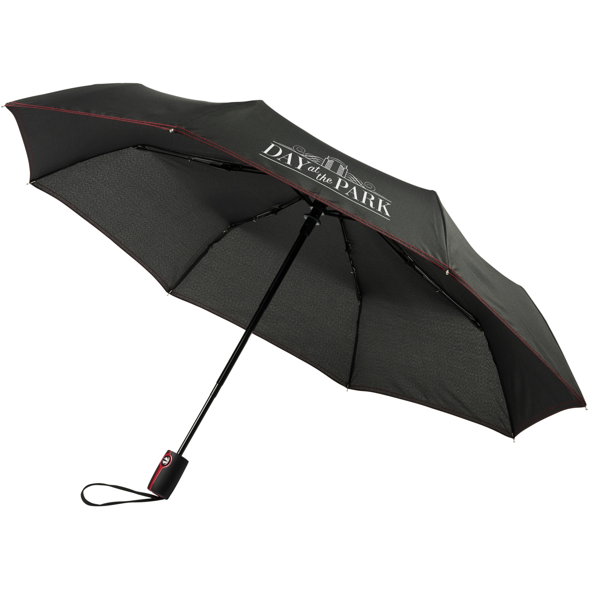 Automatic open and close foldable umbrella with a pongee polyester canopy. Sturdy metal shaft, a high quality frame with fibreglass ribs that offers maximum flexibility in windy conditions. Supplied with a pouch and can easily fit in a handbag or backpack for convenient carrying. Coloured details are available on the soft touch handle and detailed sewing on the canopy and pouch. Large decoration area on each of the panels, as well as the handle.