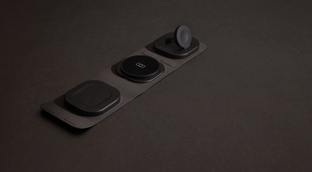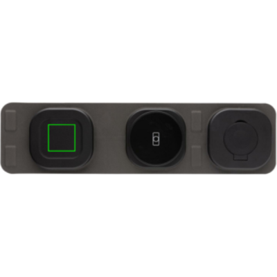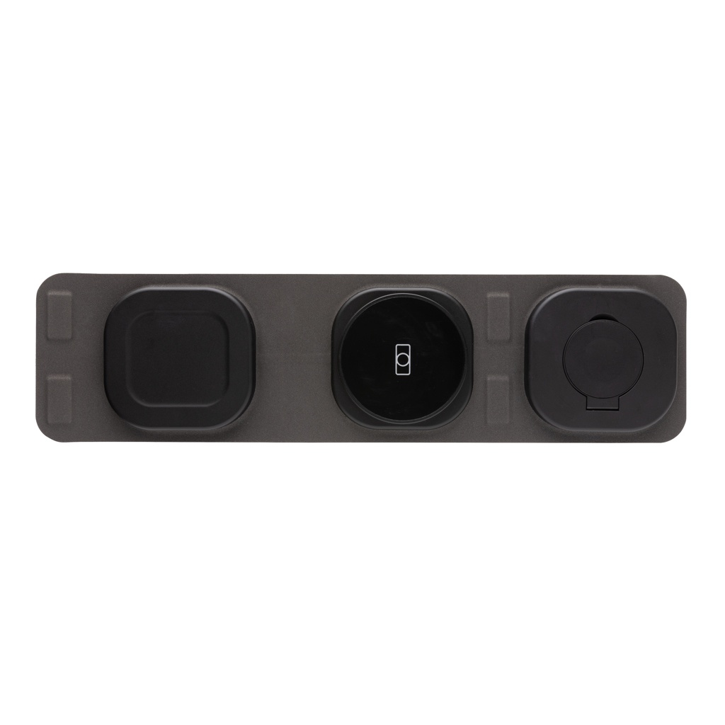 Luxury and foldable 3-in-1 wireless charger made with RCS recycled ABS Total recycled content: 46% based on total item weight. RCS certification ensures a completely certified supply chain of the recycled materials. The wireless charger comes equipped with a magnetic 15W wireless charger and an additional 5W wireless charger suitable for earbuds cases or other small wireless chargeable devices and a 2.5W wireless charger for smartwatches ( Apple watches only). Including RCS certified 120 cm recycled TPE cable. Packed in FSC® mix kraft packaging. Item and accessories 100% PVC free. Input: 9V/3A for optimal use. Output: Phone: 9V/1.1A; 9V/1.67 A/(15W), Earbuds: 5V/1A (5W), Watch: 5V/0.5A.
