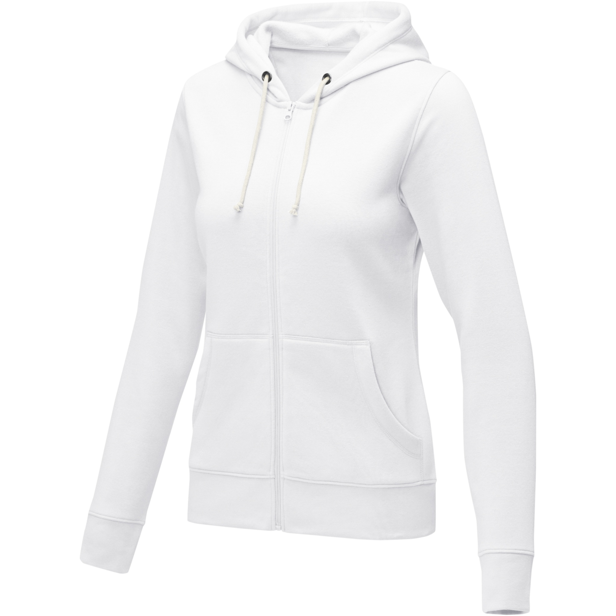 The Theron women's full zip hoodie – where style meets comfort in perfect harmony. This hoodie is a true embodiment of classic design. Additionally, the interior custom branding options allow personalised branding or customisation inside the hoodie. A kangaroo pocket combines convenience with a modern aesthetic. The flat knit rib bottom hem and cuffs guarantee a secure fit, while the brushed interior maximizes softness. The 240 g/m² fabric, blend of cotton and polyester, promises warmth and durability. Elevate your wardrobe with the Theron full zip hoodie. This hoodie is designed with a fitted shape for a feminine look.