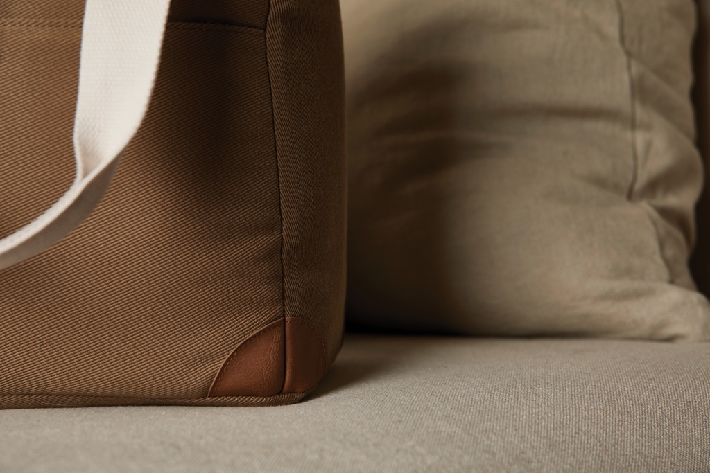 An elegant cooler bag made of recycled polyester woven to resemble durable canvas twill. Outer fabric in 100% recycled polyester from PET bottles. Exclusive details in PU, made of so-called waterborne PU, where primarily water is used to replace strong solvents in the production process. This process is better for the environment, but above all for factory workers. This cooler bag is insulated with extra thick foam and lined with so-called PEVA, a material that is easy to keep clean and fresh.