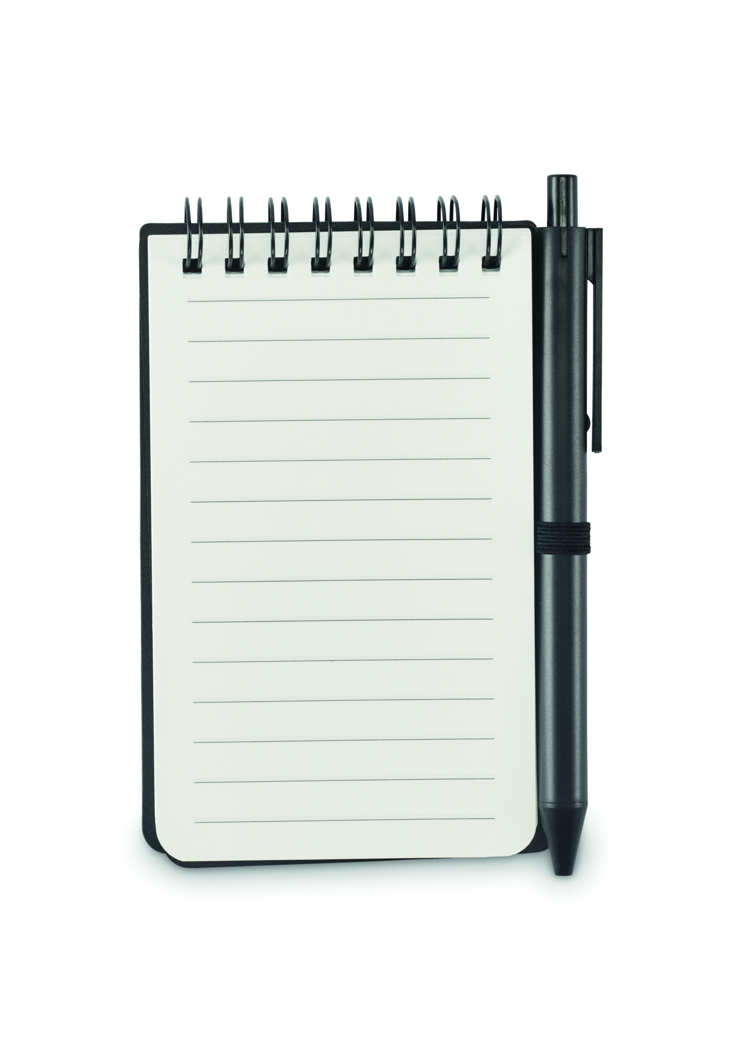 Water repellent notepad in PP cover with pen. Twin-wire. Mineral paper 120 gr/m², 50 sheets lined. Blue ink. Elastic closure strap and pen holder.