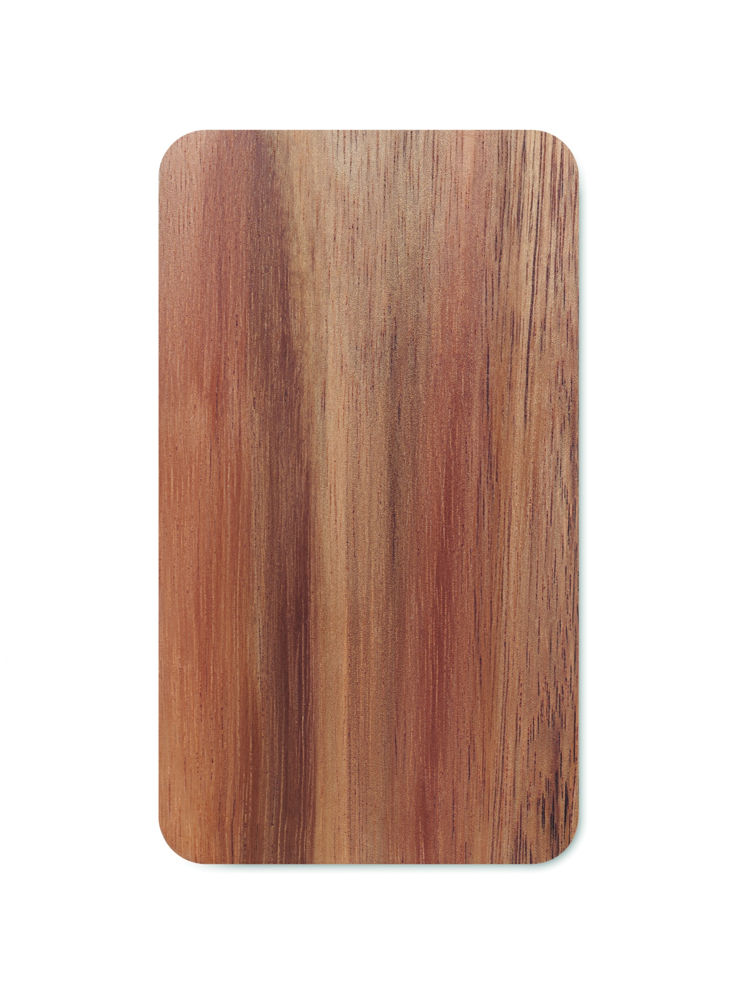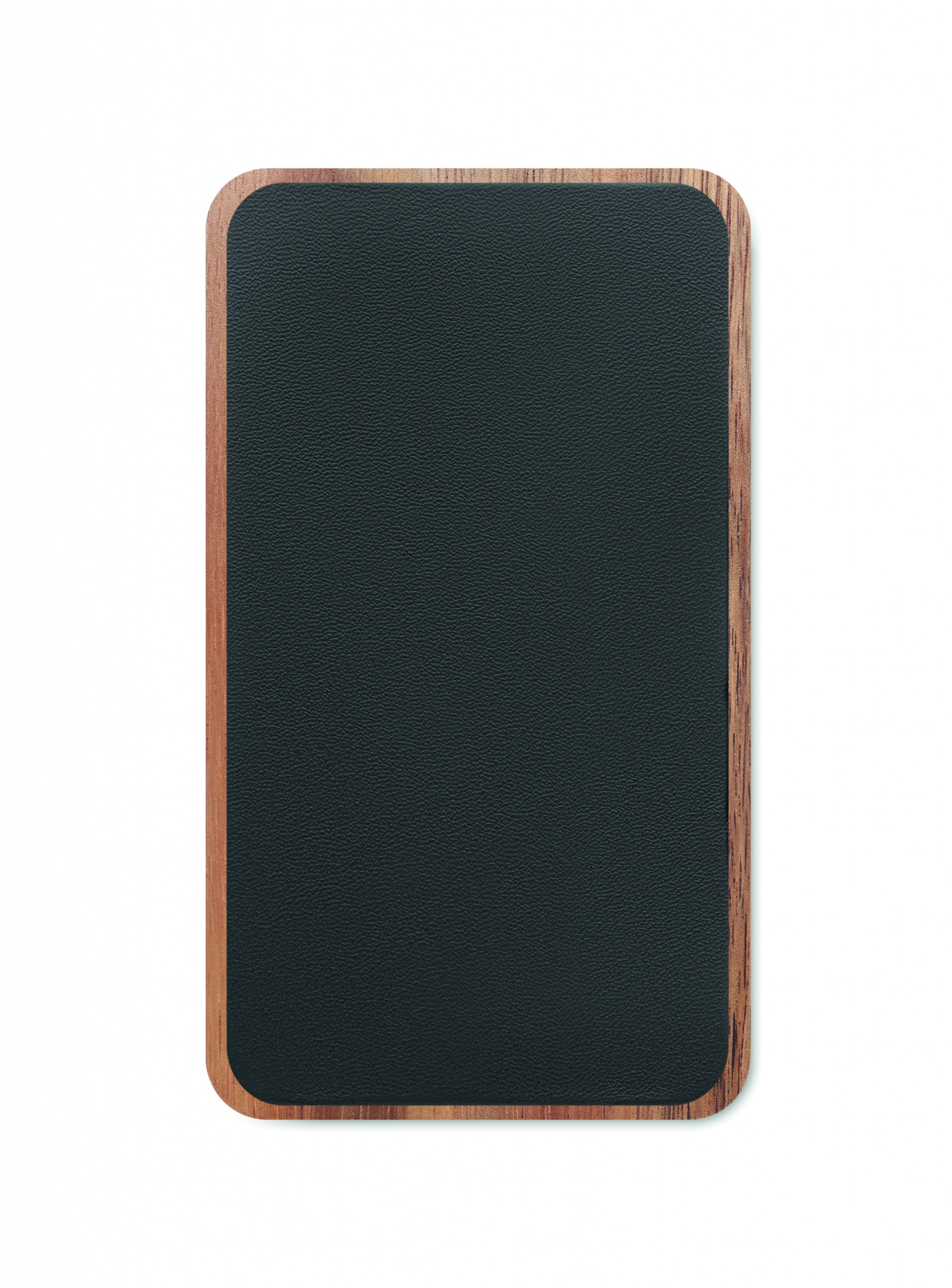 15W wireless charging and 4000mAh power bank with acacia wood casing and recycled PU, which is 58% recycled (40% recycled polyester and 18% recycled PU). Supports quick charging technology (20W). In/Output: Type-C.