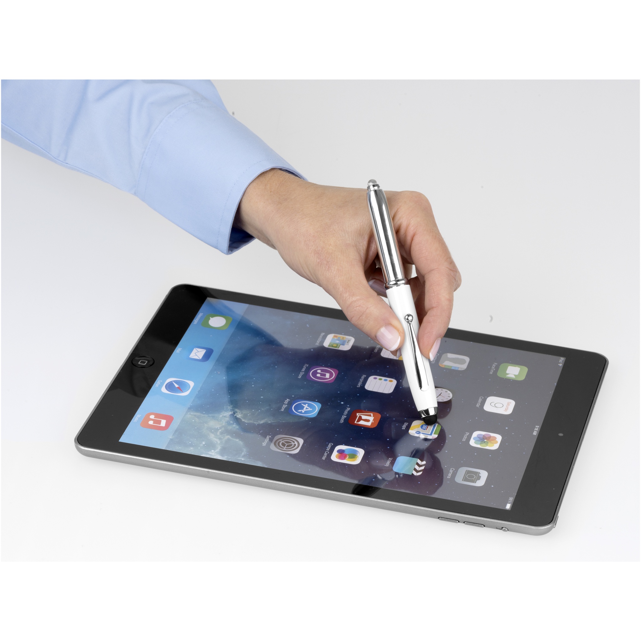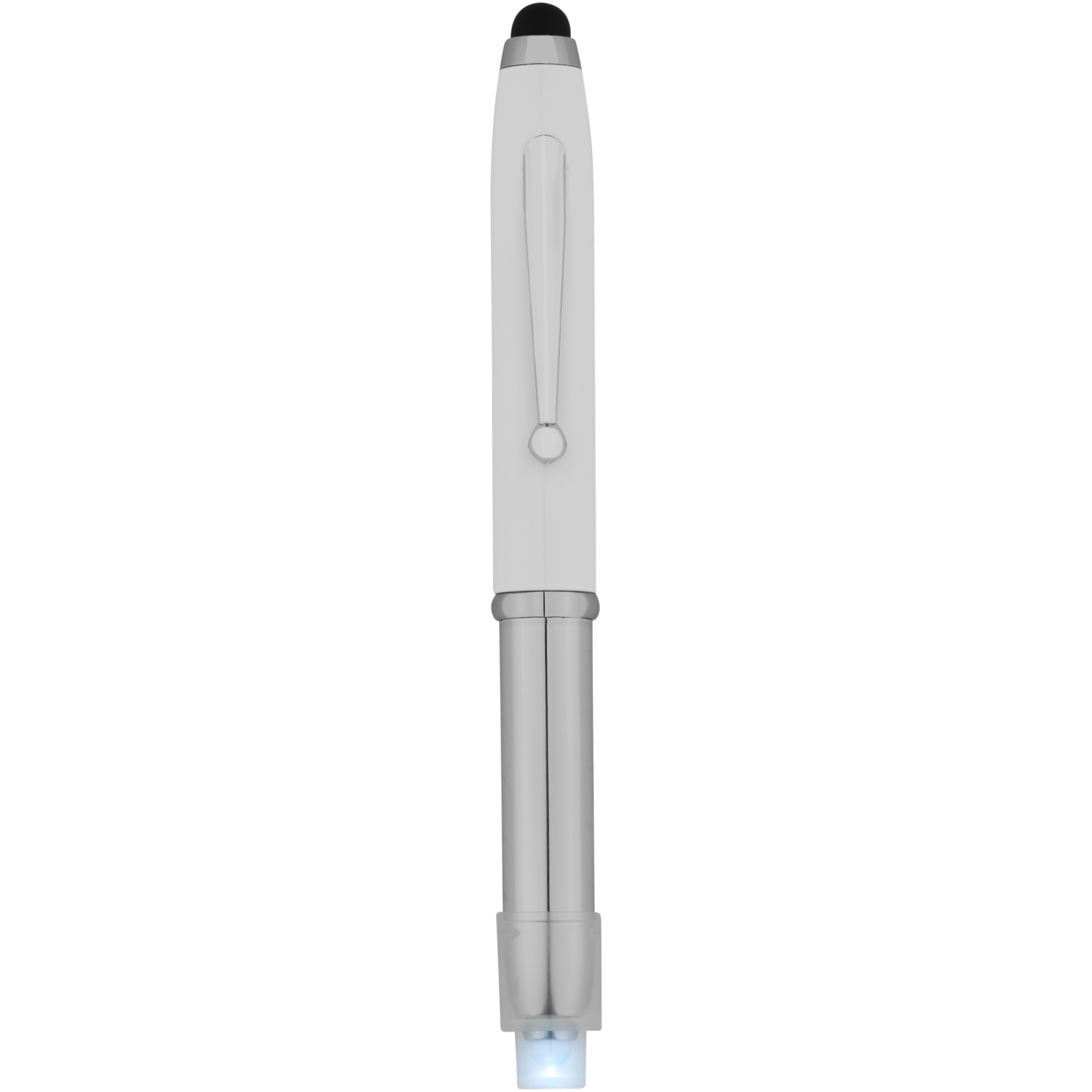 Stylus ballpoint pen with single LED flashlight and removable cap. Batteries included.