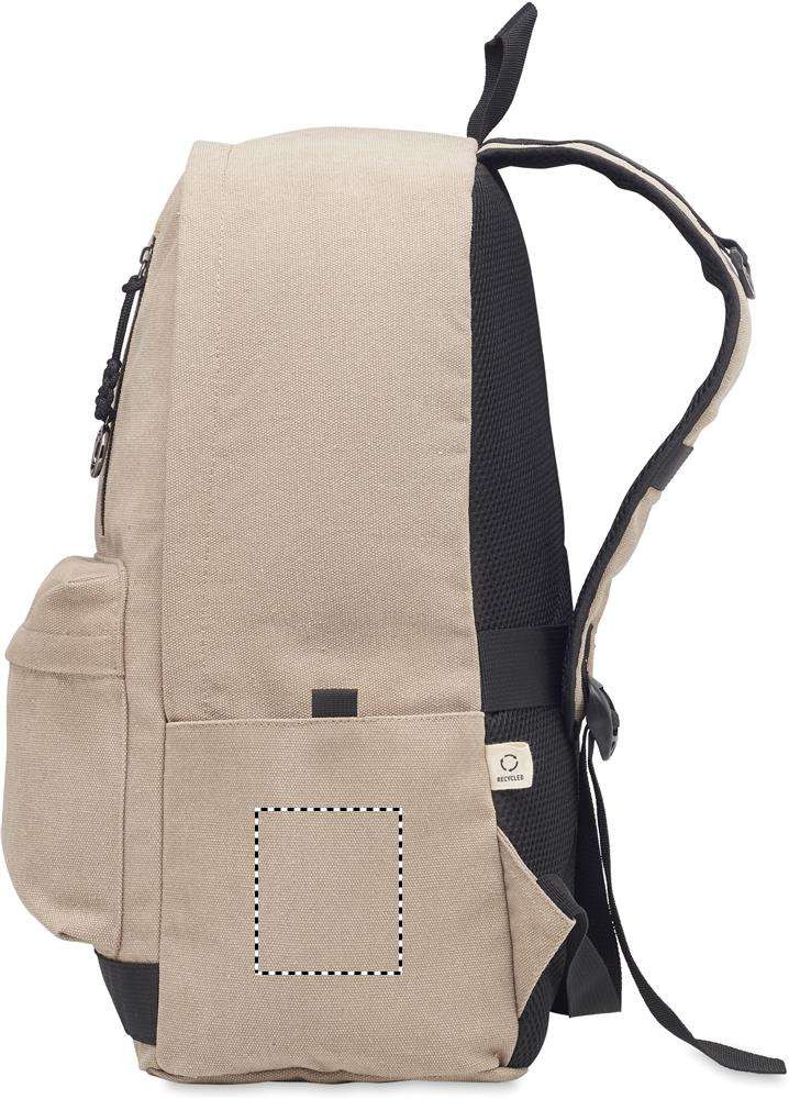 Taaskasutatud pestud lõuendist 15-tolline sülearvuti seljakott. Suur eesmine lukuga tasku sisemise sülearvuti sahtliga. Ees väike lukuga tasku. Kaks külglibisevat taskut. Polsterdatud selja- ja õlarihmad, tagapaneel ja alus. 450 gr/m².