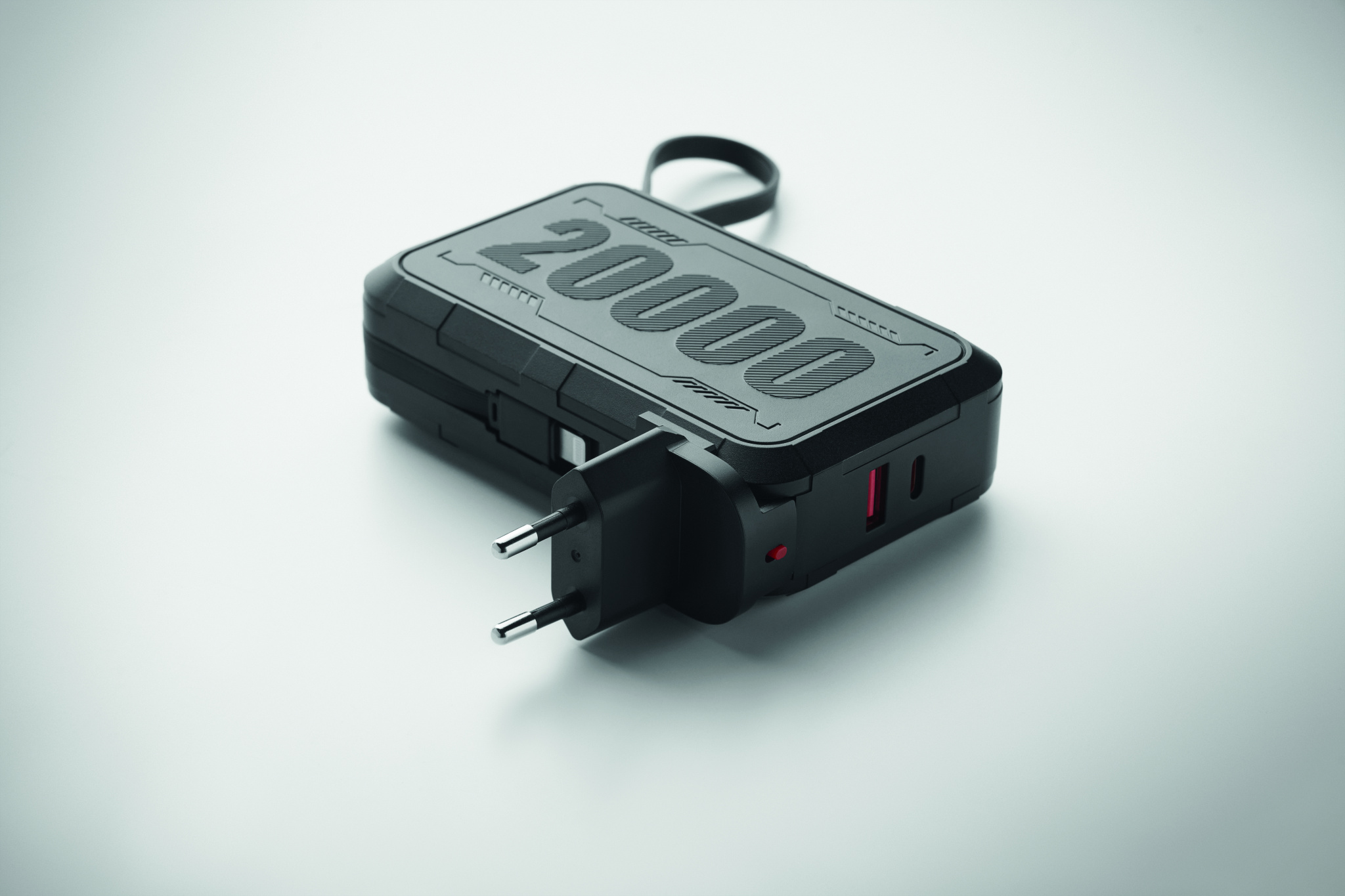 20000 mAh ABS-plastist akupank sisseehitatud USA pistiku ja eemaldatava vahelduvvoolupistikuga. USB A ja C-tüüpi sisend/väljund. C-tüüpi ja kaks ühes integreeritud kaabel.
