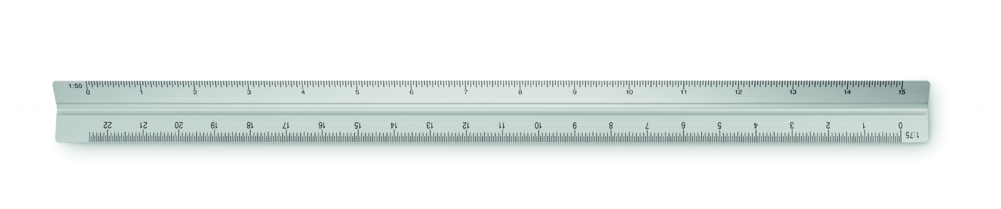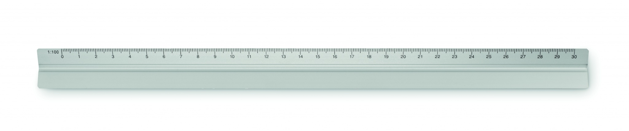 30 cm kolmnurkne alumiiniumist arhitektuurne joonlaud. 3 külge ja 5 erinevat mõõteskaalat 1:20, 1:25, 1:50, 1:75, 1:100.