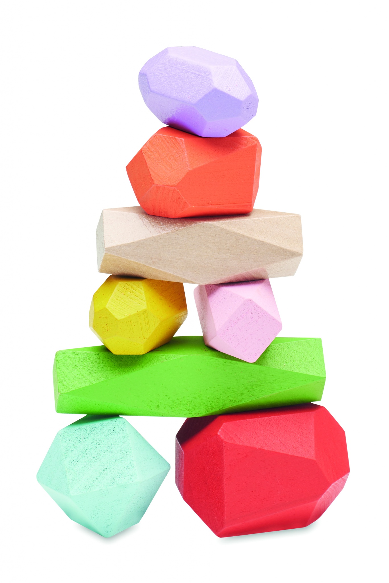 8 värvilist puidust virnastatavat kivi, mis on seatud puuvillasesse nöörikotti.