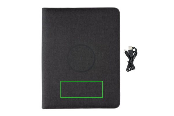 See A4-formaadis portfolio-märkmik sisaldab uusimat tehnoloogiat. Esikaanel on juhtmevaba laadimisalus teie telefoni jaoks. (Androidi uusimad põlvkonnad, iPhone 8 ja uuemad). Vanemaid telefone ja tahvelarvuteid saab laadida USB-portide kaudu välise 5000 mAh toitepangaga. Sisend: 5,0V/2,1A. Väljund 1: 5,0V/2,1A. Väljund 2: 5,0 V/2,1 A. Juhtmeta väljund: 5 W. Registreeritud disain®