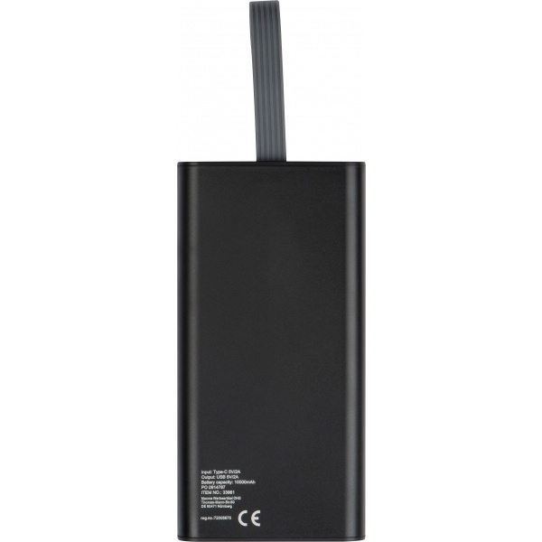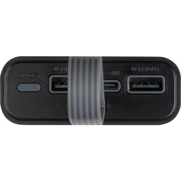 Toitepank 10 000 mAh, kolme pordiga (USB1/OUT, Type-c/IN, USB2/OUT), laadimistaseme indikaatori ja kanderihmaga.