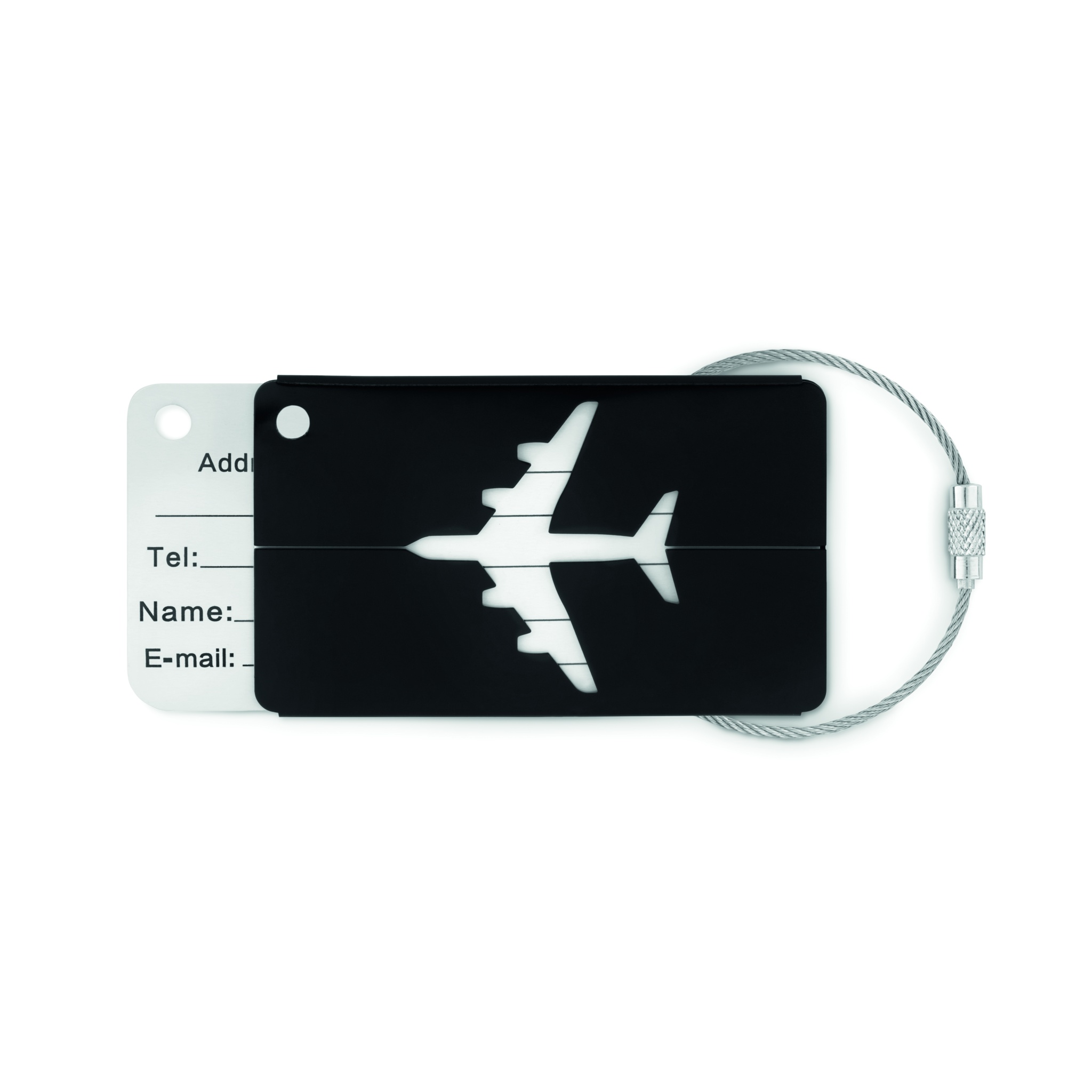 Alumiiniumist lennukipagasi silt nime ja aadressisildiga. Kaasas metallnöör ja kruviühendus.