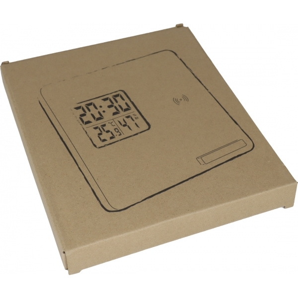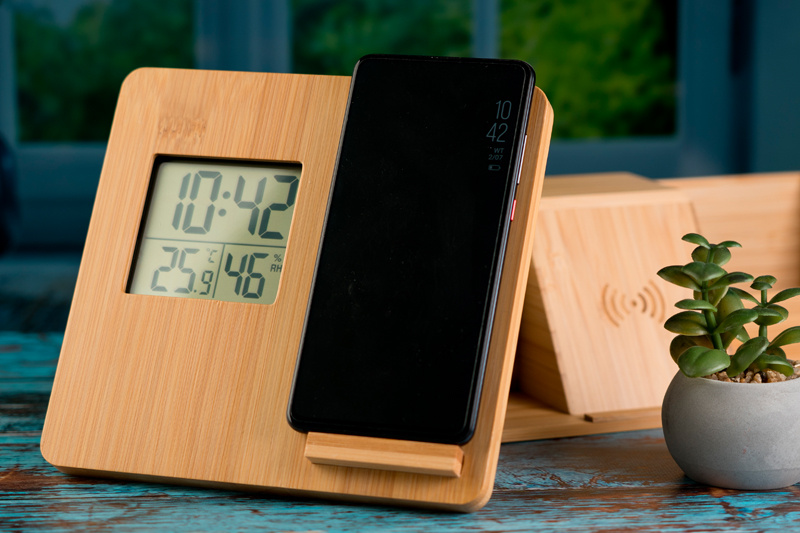 Bambusest ilmajaam / juhtmevaba laadija digitaalse ekraaniga, mis näitab temperatuuri, niiskust ja aega. Stabiilsel alusel. Teie logo graveeritakse esiküljele.