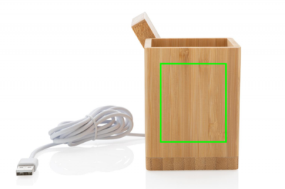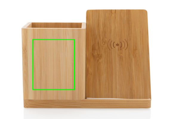 10 W juhtmevaba kiirlaadija koos pliiatsihoidjaga, mis on valmistatud RCS (Recycled Claim Standard) sertifitseeritud taaskasutatud ABS-ist. Kogu taaskasutatud sisaldus: 6% eseme kogukaalust (sh bambusest alus) Korraldaja bambusest välispind on täielikult valmistatud FSC 100 bambusest. Kaasa arvatud 120 cm C-tüüpi laadimiskaabel, mis on valmistatud RCS-sertifikaadiga taaskasutatud TPE-st. Pakitud FSC mix kraft karpi. Type-C sisend 5V/2A; 9V/1,67A. Juhtmeta väljund 5V/1A;9V/1.1A (10W) Registreeritud disain®