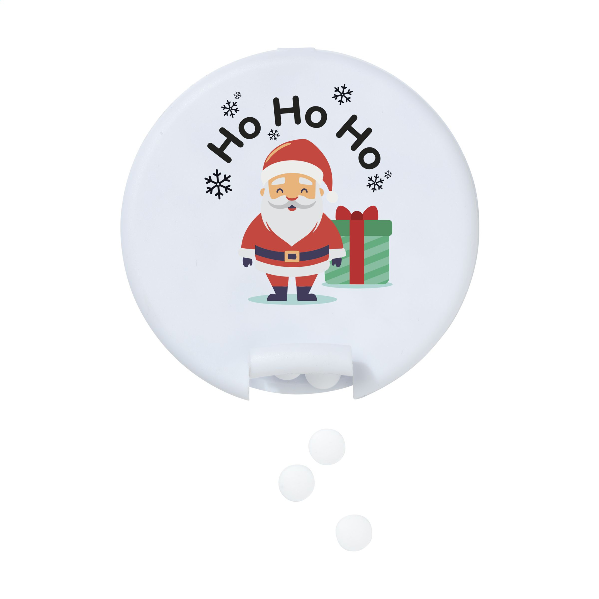 Ümmargune plastikust dosaator, mis on täidetud u. 12 g (55 tk) suhkruvaba piparmündi. - See toode on trükitud tavalise jõulukujundusega. Valikus on 6 erinevat kujundust, nagu piltidel näha. Disaini pole võimalik kohandada.
