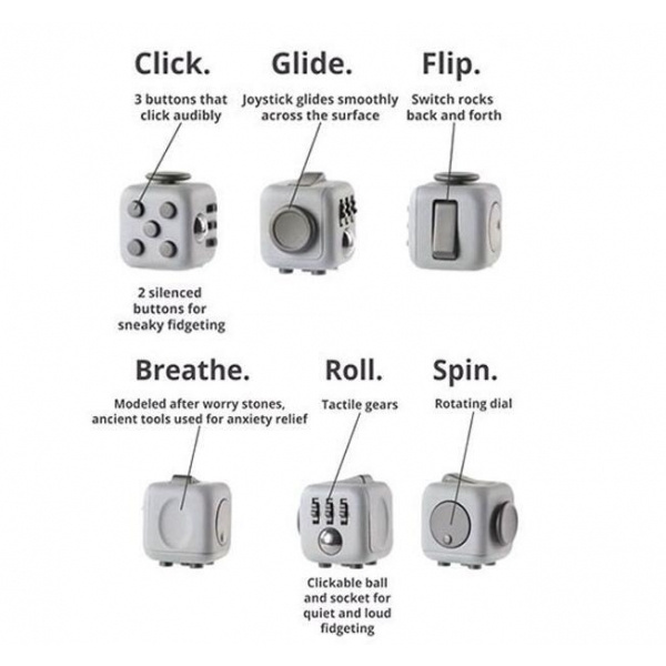 Fidget Cube on lauamänguasi kõigile, kellele meeldib askeldada. Sellel on kuus külge. Igal küljel on midagi, mille kallal askeldada: klõpsa, libiseb, pööra, hinga, veere, keeruta. Fidget Cube on saadaval 10 erinevas värviskeemis: must, kollane, roosa, roheline, sinine, hall.