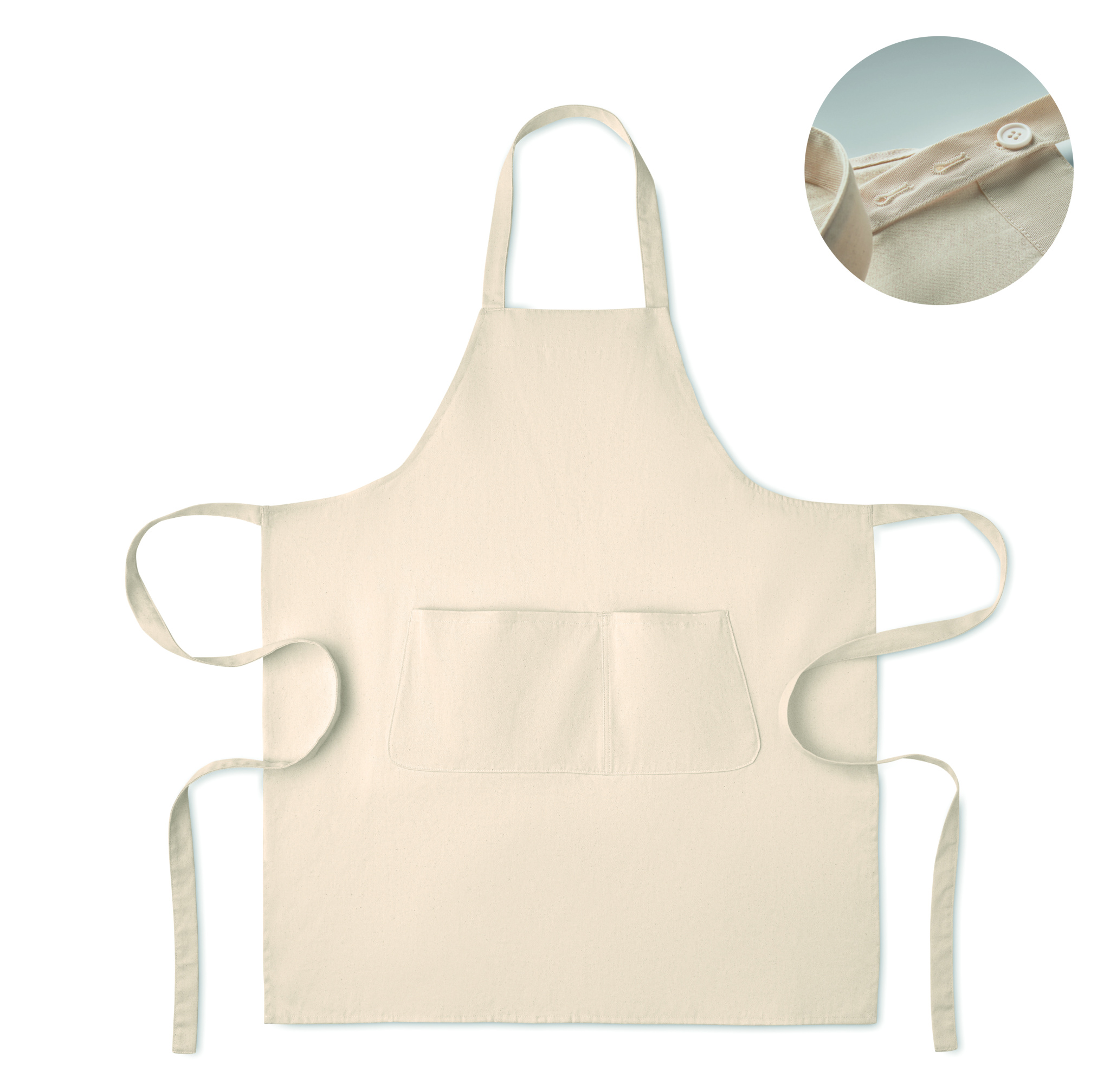 Reguleeritava suurusega põll ühe suure esitasku ja kahe sektsiooniga. Valmistatud 240 g/m² orgaanilisest puuvillast. Kaelarihmal on reguleeritav nööp. Toode on OEKO-TEX® STANDARD 100 sertifikaadiga.