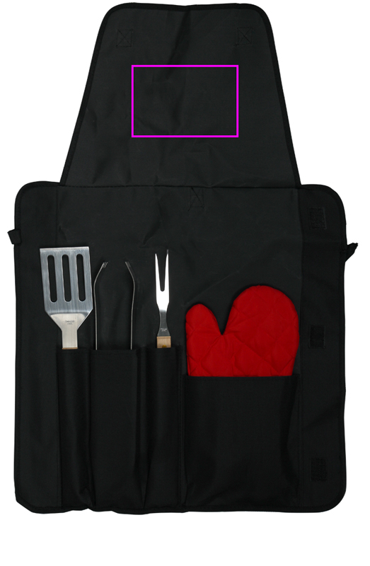 Nailonist põll grillkinda, roostevabast terasest kahvli, tangide ja puidust käepidemega treiriga. Trükime teie logo põllele.
