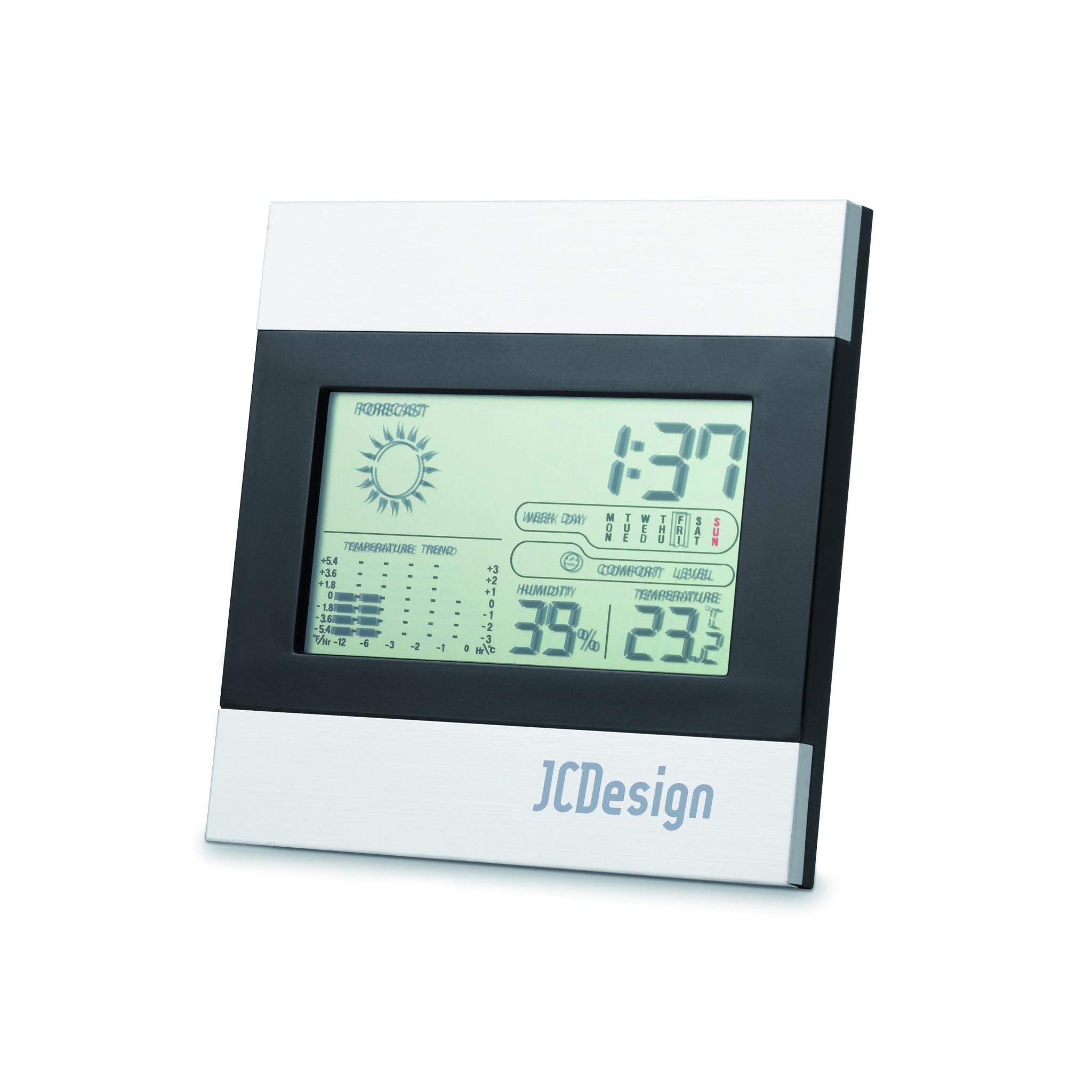 Must-hõbedane ilmajaam. Sisaldab kella, temperatuuri niiskuse näitu ja kalendrit. 2 AAA patareid ei kuulu komplekti.