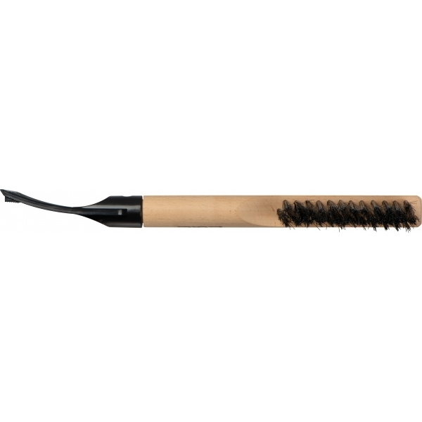 2-in-1 jääkaabits koos lumeharjaga. Sellel on puidust käepide ja riputusaas jääkaabitsa küljes.