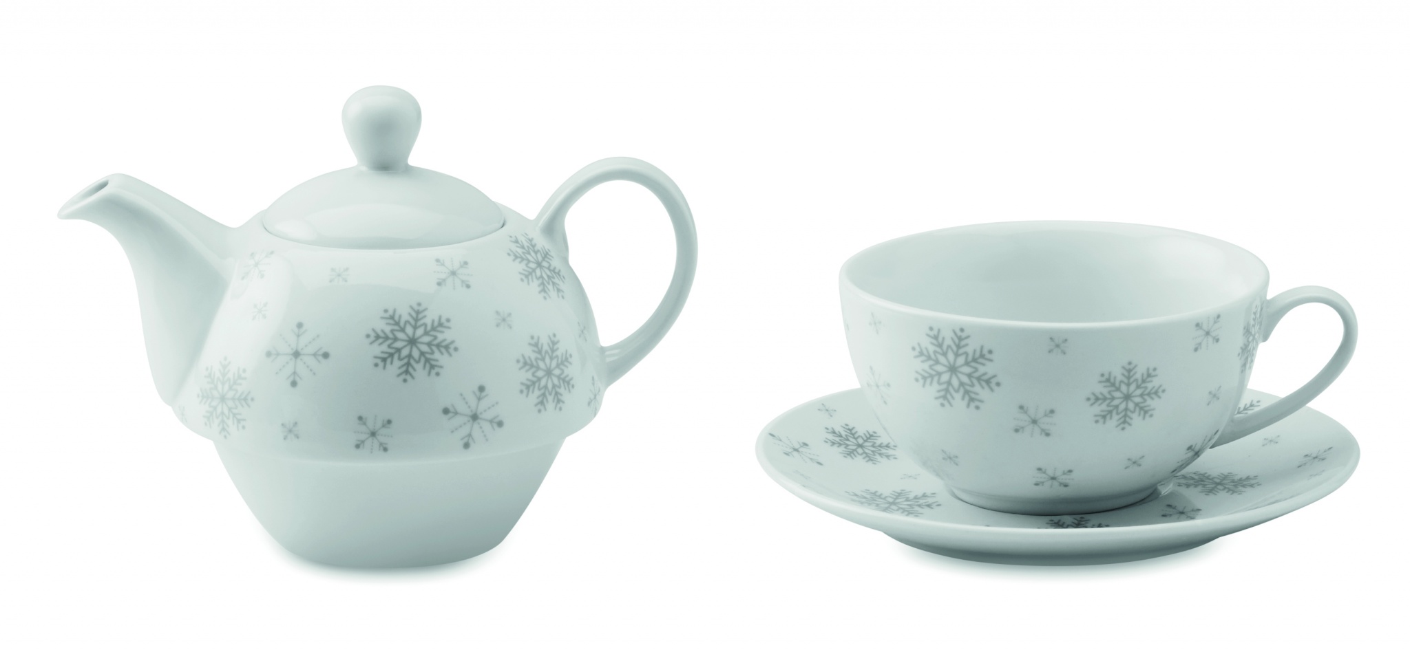 Teekomplekt, mis sisaldab 400 ml lumehelbekujundusega teekannu ja 260 ml keraamilist tassi. Pakitud kartongist kinkekarbis. Keraamiline ülekandematerjal on nõudepesumasinas pestav, tampprint ei ole nõudepesumasinas pestav.