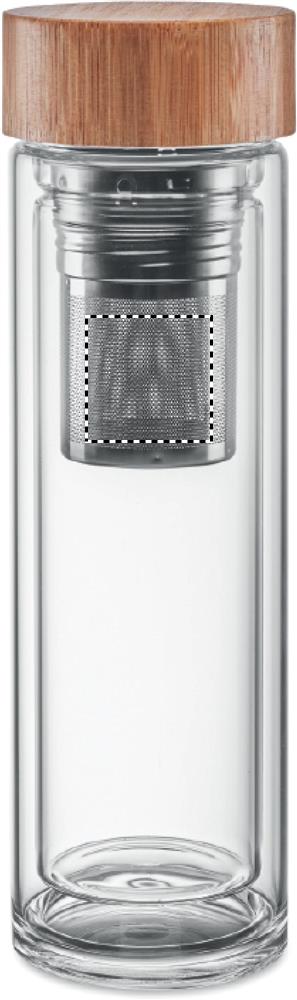 Topeltsein kõrge boorsilikaatklaasist pudelis ja bambusest kaas koos teetõmmisega. Mahutavus: 400 ml. Bambus on looduslik toode, ühe eseme värvis ja suuruses võib esineda väikesi erinevusi, mis võivad mõjutada lõppviimistlust. Lekkevaba. Boorsilikaatklaasile ei ole lasergraveerimine võimalik.
