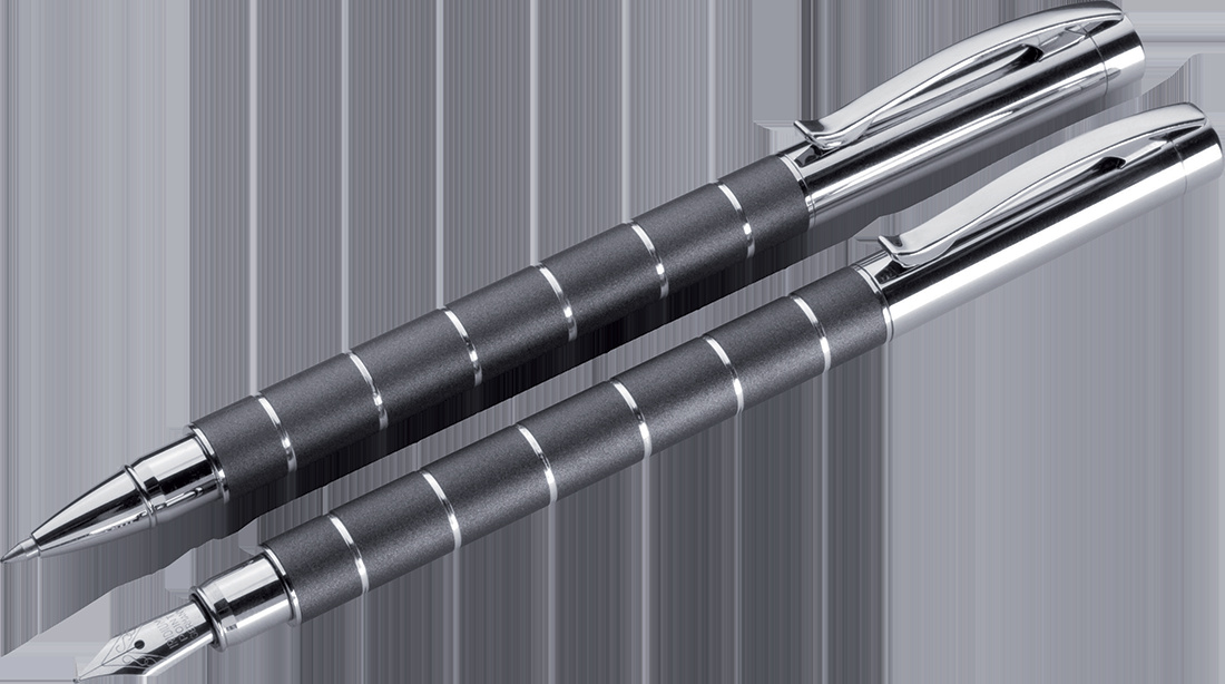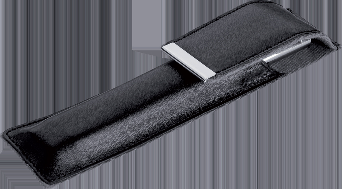Kirjutuskomplekt, mis koosneb kvaliteetsest klapiga ümbrisest, suure musta plastikust täidisega pastapliiatsist ja täitesulepeast.