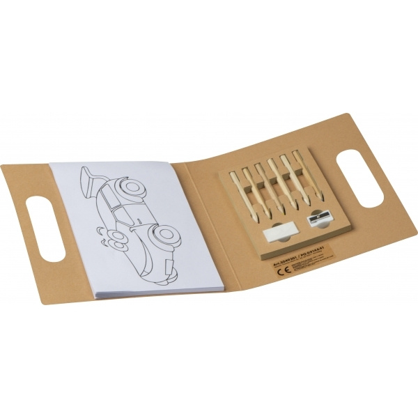 Taaskasutatud kaanega värvimisraamatu kaust, värviplokk (30 lehte), kandehoidja, teritaja, kustutuskumm ja 6 erinevat värvi värvipliiatsid. Teie logo trükitakse kaanele.