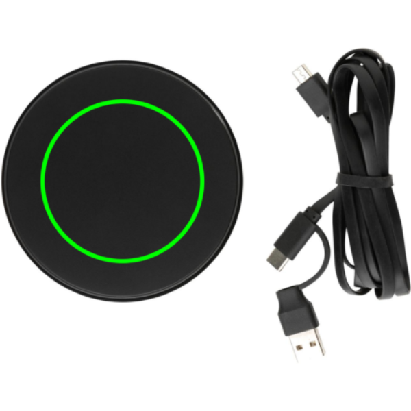 10 W juhtmevaba laadija kahe pistikuga kaabliga (USB A ja USB C), mille korpus on valmistatud RCS-sertifikaadiga taaskasutatud ABS-plastist ja juhe taaskasutatud TPE-st. Taaskasutatud kogusisaldus 58% kauba kogukaalust. RCS (Recycled Claim Standard) on standard toote ringlussevõetud sisu kontrollimiseks kogu tarneahelas. RCS on standard, mida kasutatakse juhul, kui osa esemest on valmistatud taaskasutatud materjalidest. Juhtmeta laadimine ühildub Androidi uusimate põlvkondade, iPhone 8 ja uuemate versioonidega. Sisend: 9V/1,5A. Juhtmeta väljund: 9V/1,1A 10W. Toode ja tarvikud PVC-vaba. Sisaldab 150 cm PVC-vaba ringlussevõetud TPE-kaablit, mis pakub ühendust nii USB A kui ka C-tüüpi adapteritega.