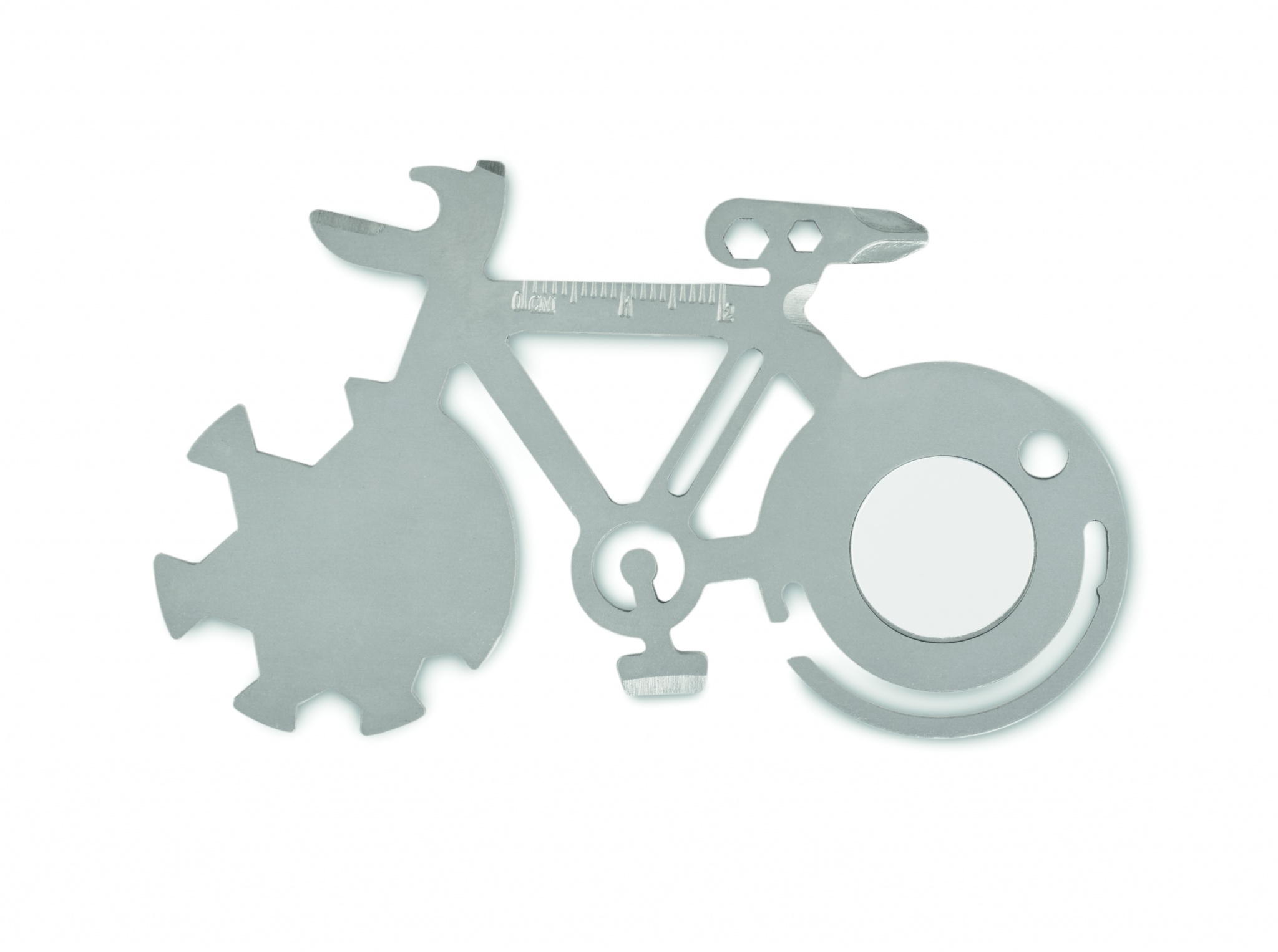 Mitme tööriistaga 11-ühes roostevabast terasest jalgratta kujuline. Pudeliavaja, noa, joonlaua või Phillipsi kruvikeeraja tööriistadest.