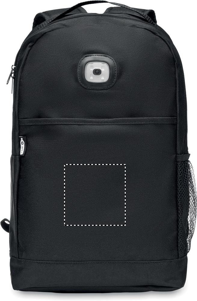 600D RPET-ist seljakott, mille esipaneelil on eemaldatav COB-valgusti. Valge COB-valgusti 3 erineva valguse heleduse seadistusega. Haagi ja aasaga suletav esitasku. Küljel võrktasku. Komplektis nööpatarei.