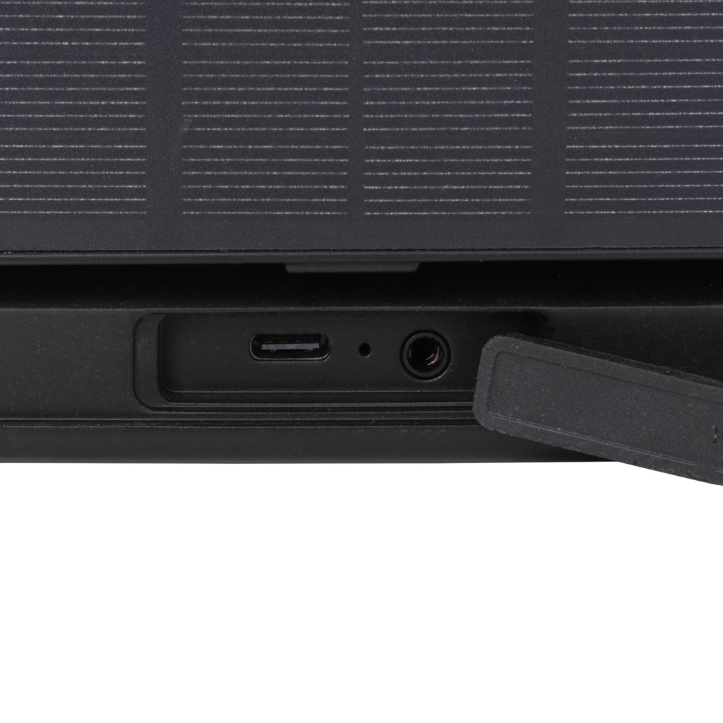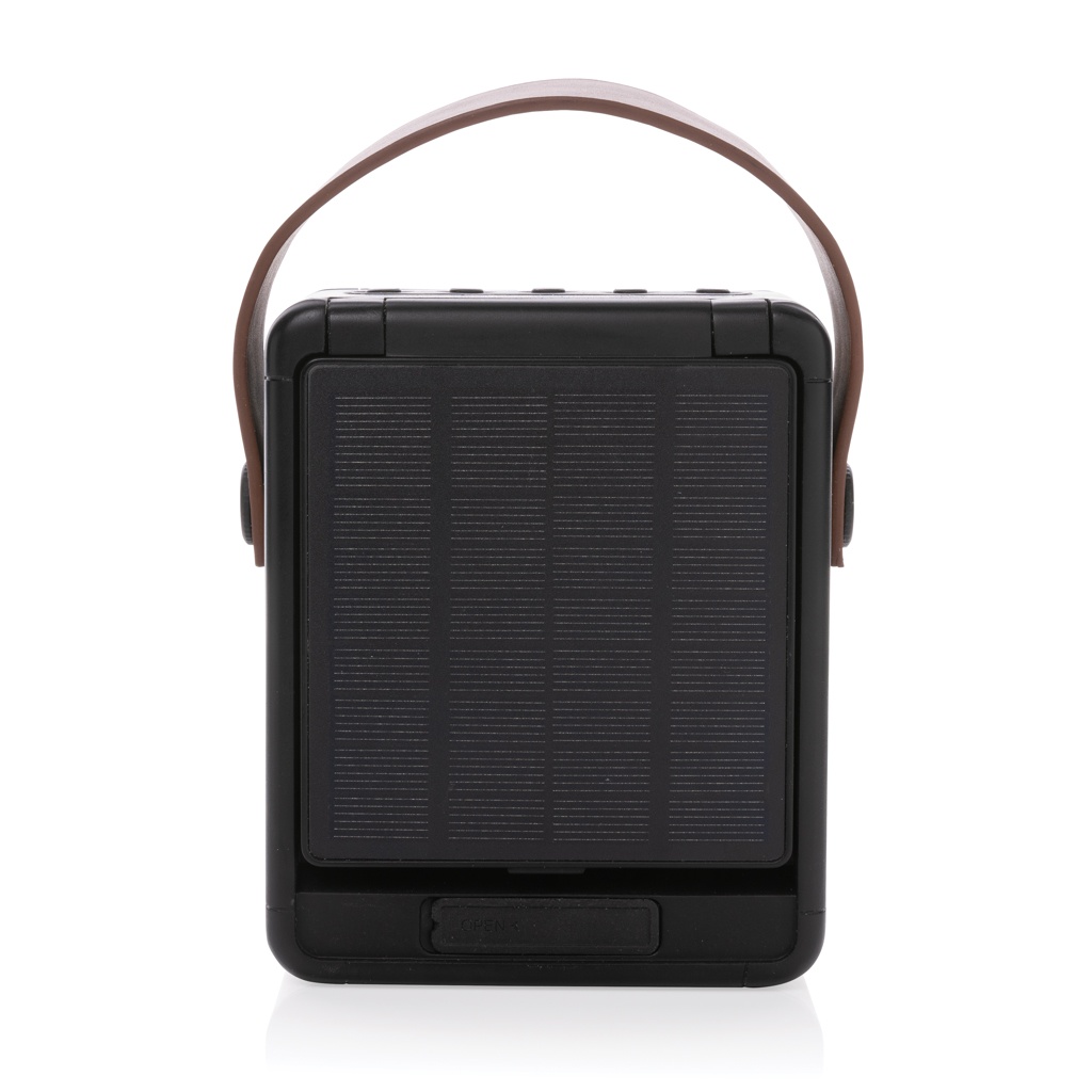 Võimas 12 W juhtmevaba kõlar integreeritud suure päikesepaneeliga RCS-sertifikaadiga taaskasutatud ABS-st. Kogu taaskasutatud sisaldus: 16% eseme kogukaalust. RCS-sertifikaat tagab taaskasutatud materjalide täielikult sertifitseeritud tarneahela. Kõlar kasutab kvaliteetseid monokristallilisi päikesepaneele, mille konversioonimäär on 19%. Tasu määr sõltub tingimustest. Integreeritud LED-lambiga, et kasutada kõlarit ka siis, kui päike on loojunud. Kõlar on varustatud 2000 mAh akuga, et tagada kuni 8 tundi esitusaega ning BT5.3 sujuva ühenduse ja selge heli tagamiseks. Ühendusulatus kuni 10 meetrit. Kõnedele vastamiseks mikrofoni ja vastuvõtmisfunktsiooniga. Laadimiskiirus päikeseenergia: 5V/300mA. Pakitud FSC mix FSC® karpi. Kaasa arvatud RCS-sertifikaadiga taaskasutatud TPE laadimiskaabel. Toode ja tarvikud 100% PVC-vaba