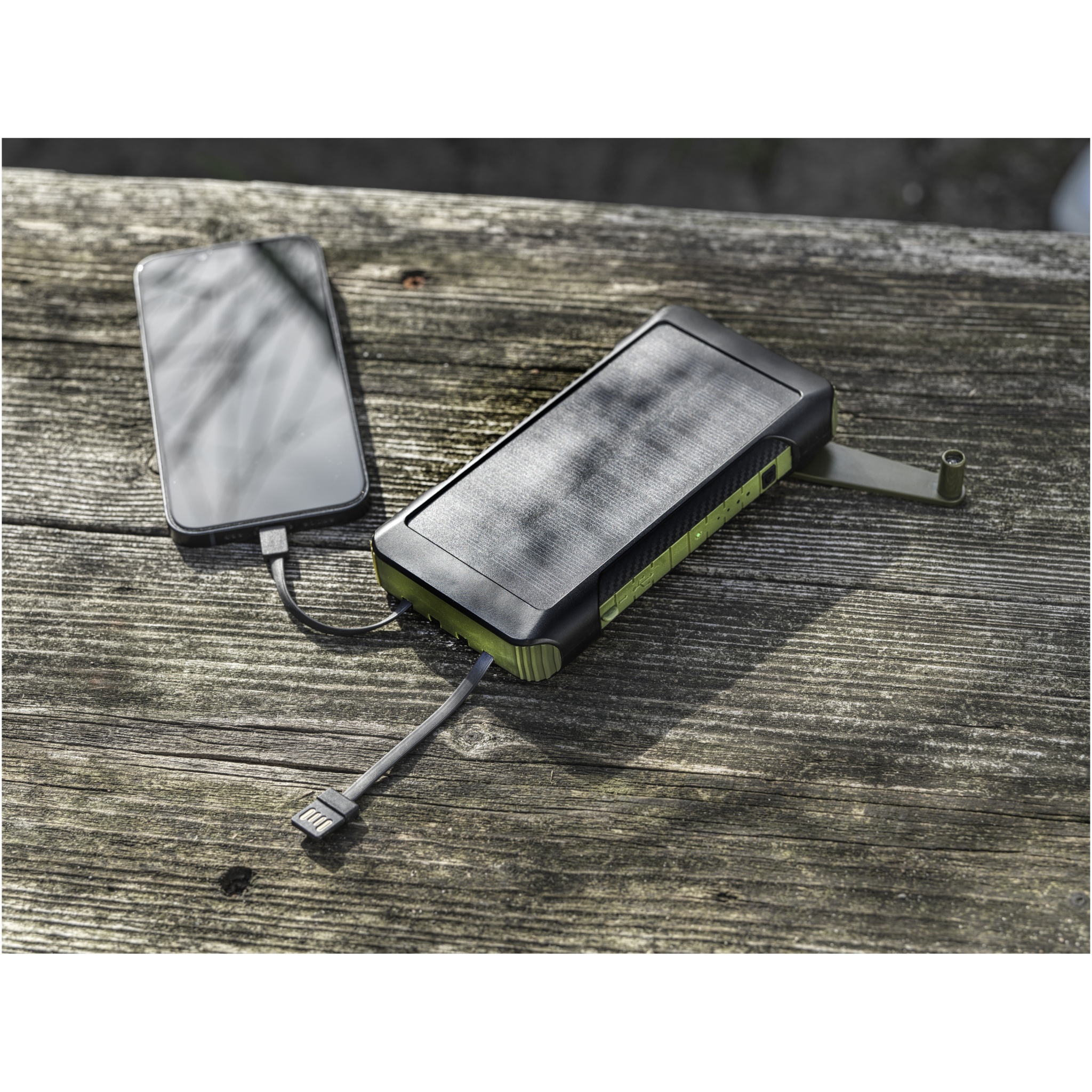 Soldy RCS taaskasutatud plastist 10 000 mAh päikeseenergiapank on ideaalne laadimiskaaslane välitegevusteks. See on varustatud käeshoitava vändadünamoga, mis genereerib võimsust käsitsi juhuks, kui võimsus otsa saab ja päikesevalgust ei ole. Toitepanka saab laadida ka C-tüüpi või seadme mikro-USB-pordi kaudu. Tänu C-tüüpi, iOS-i, USB-A- ja mikro-USB-pistikutega sisseehitatud laadimiskaablitele võimaldab see toitepank laadida enamikku nutitelefone, kaameraid, toitepanku, kõrvaklappe jne. Toitepanga maksimaalne väljundvõimsus on 2,4A pordi kohta. Sisendvõimsus on piiratud 2A-ga. Kaasas kasutusjuhend ja 30 cm USB-A-tüüpi C laadimiskaabel ning pakitud 100% taaskasutatud jõupaberist karpi.