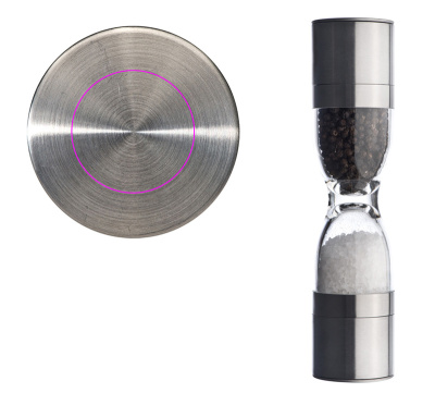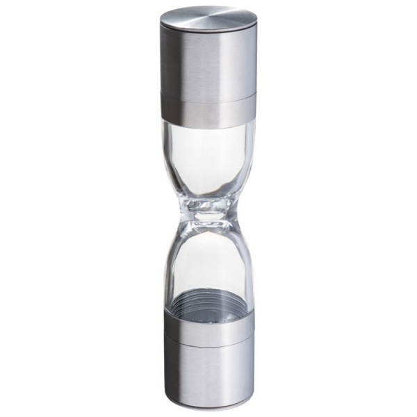 Vürtsitage seda! Täiustage oma kliendisuhet selle toreda 2-ühes soola- ja pipraveskiga. Roostevabast terasest ja plastist valmistatud veskil on kaks reguleeritavat keraamilist veski. Kare sool ja värske pipar on kergesti jahvatatud. Graveerime teie logo ühele küljele ühele roostevabast terasest kaanele. Ühekordselt pakendatud karpi.