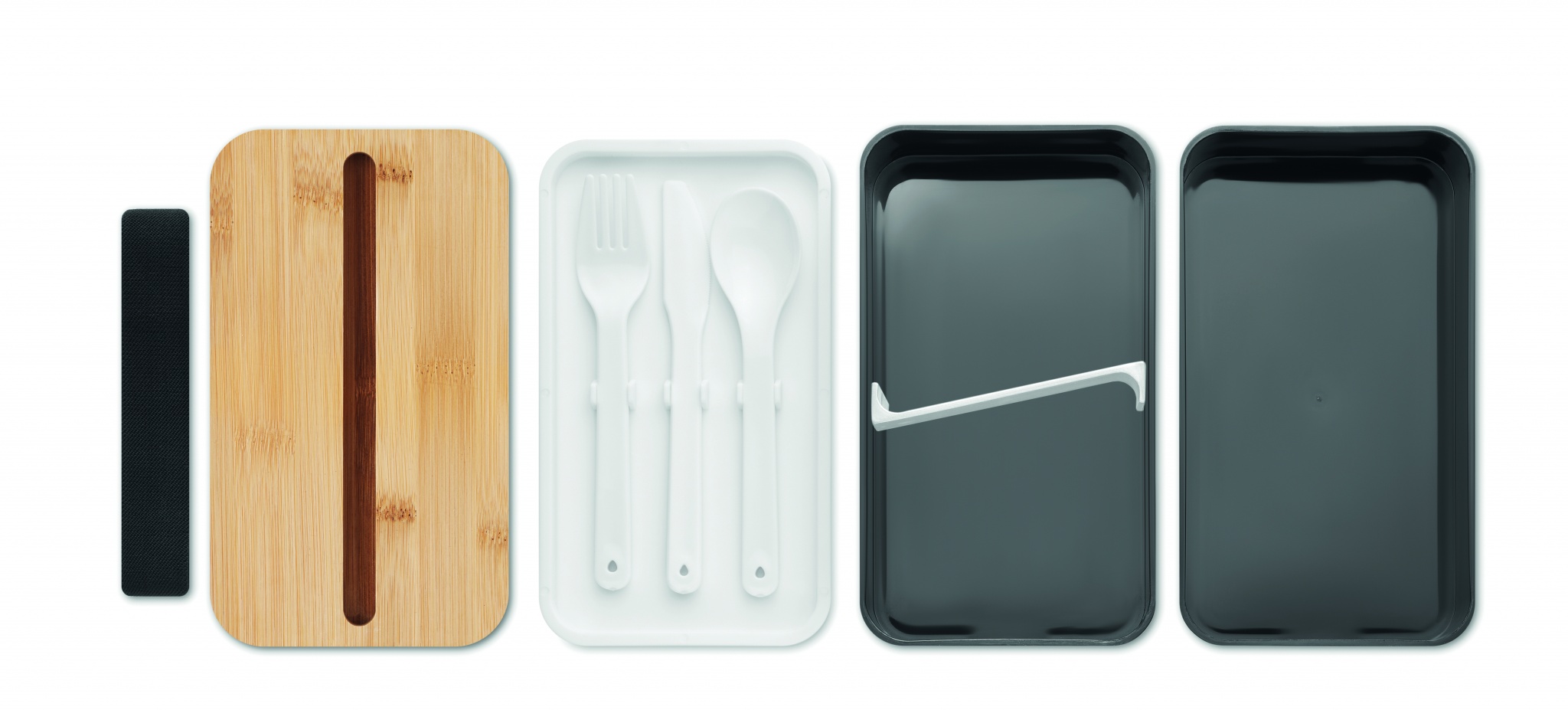 Taaskasutatud PP-st kahekorruseline lõunakarp koos eemaldatava jaoturi ja 3 söögiriistaga koos kinnitatava bambusest kaanega polüesterpaelaga. Kaanel on telefonialuse funktsionaalsus. Mahutavus: 400 ml (2x). Bambus on looduslik toode, ühe eseme värvis ja suuruses võib esineda väikesi erinevusi, mis võivad mõjutada lõppviimistlust.