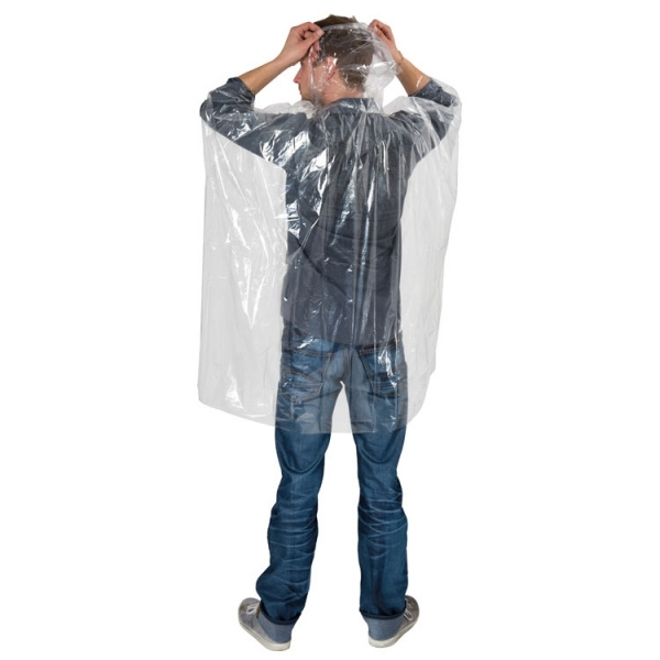 Ühekordselt kasutatav vihmapontšo plastkaanes ja trükitud paberist sisekujundusega. Kokkupandud mantli seljaosa 115 x 110 cm, kokkupandud - 16 x 9 cm.