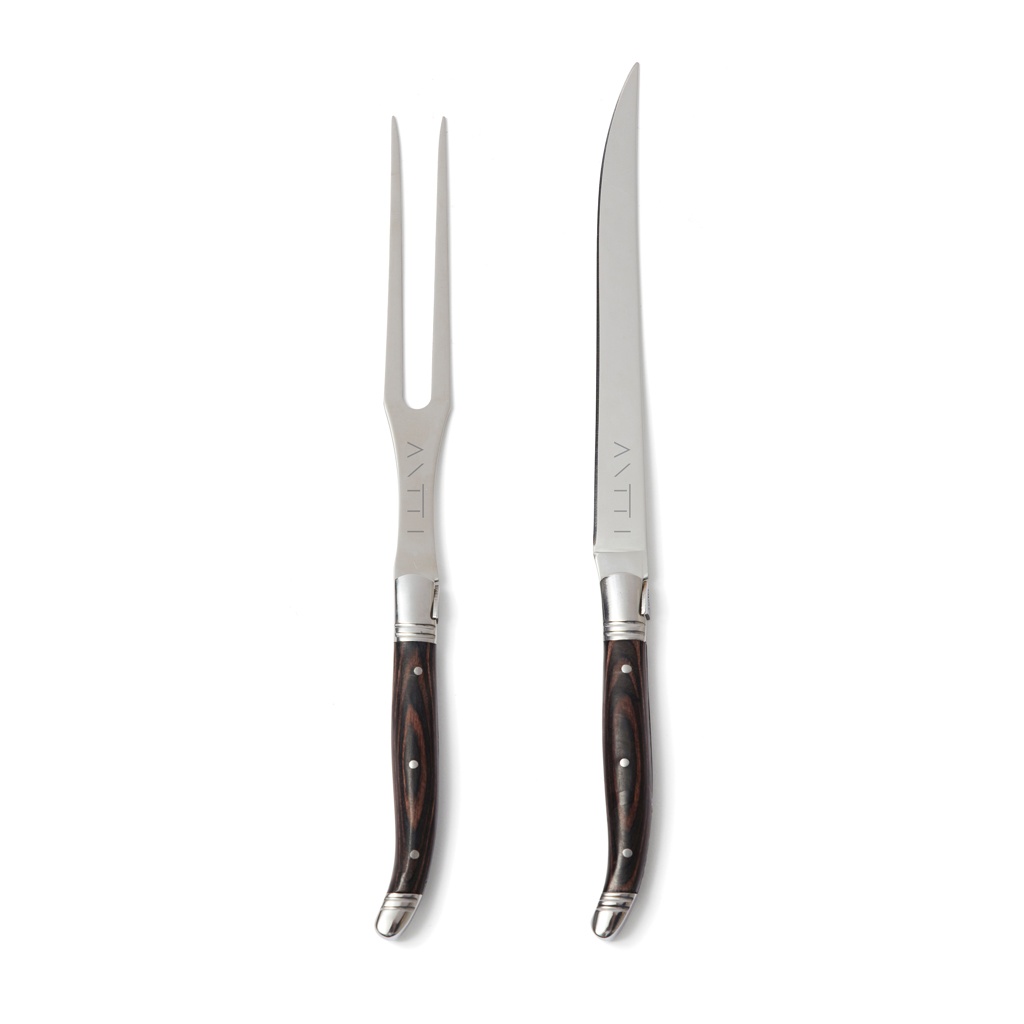 Trancheri komplekt noa ja kahvliga tüüpilises Prantsuse stiilis bistroostiilis. Must pakka puidust käepide ja kvaliteetsed roostevabast terasest terad. Pakitud eksklusiivsesse kinkekarpi.