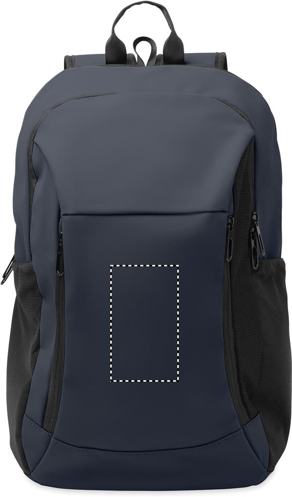 15-tuumainen läppärireppu pehmeästä PU-muovista, jossa pehmustettu selkäosa ja piilotettu vetoketjullinen päälokero. Yksi vetoketjullinen etutasku, kaksi vetoketjullista etutaskua ja kaksi joustavaa verkkotaskua sivuilla. 210D RPET -vuori.