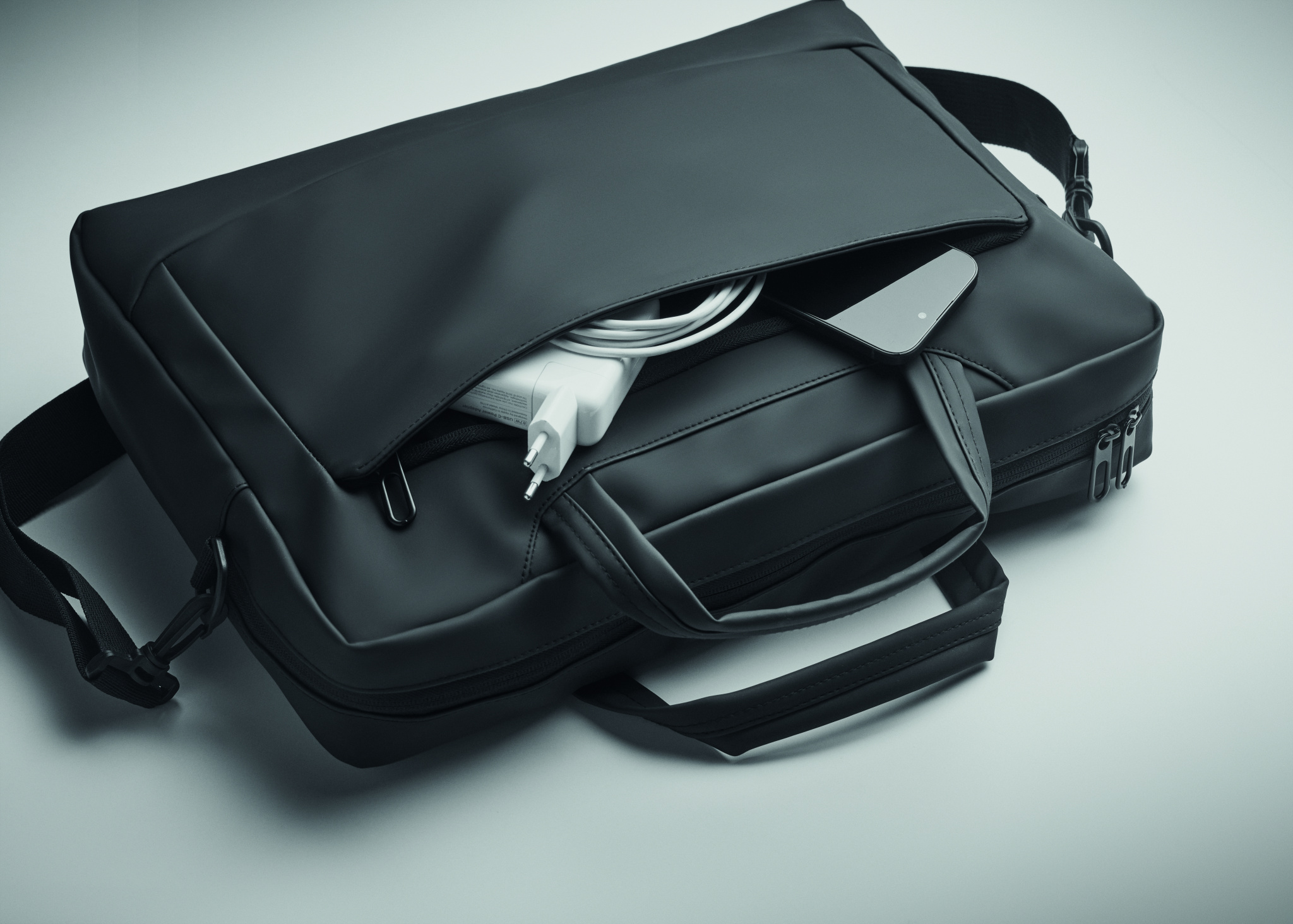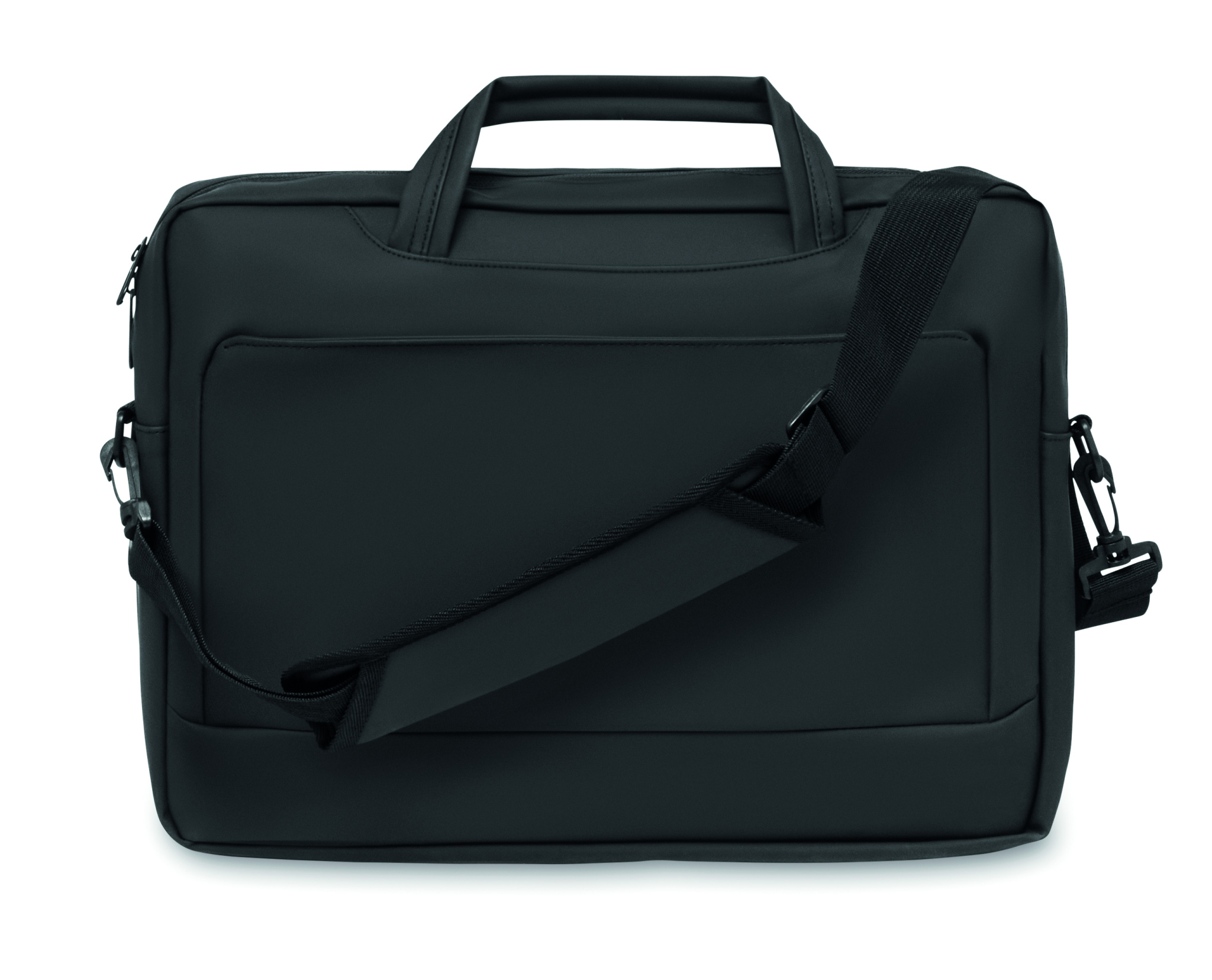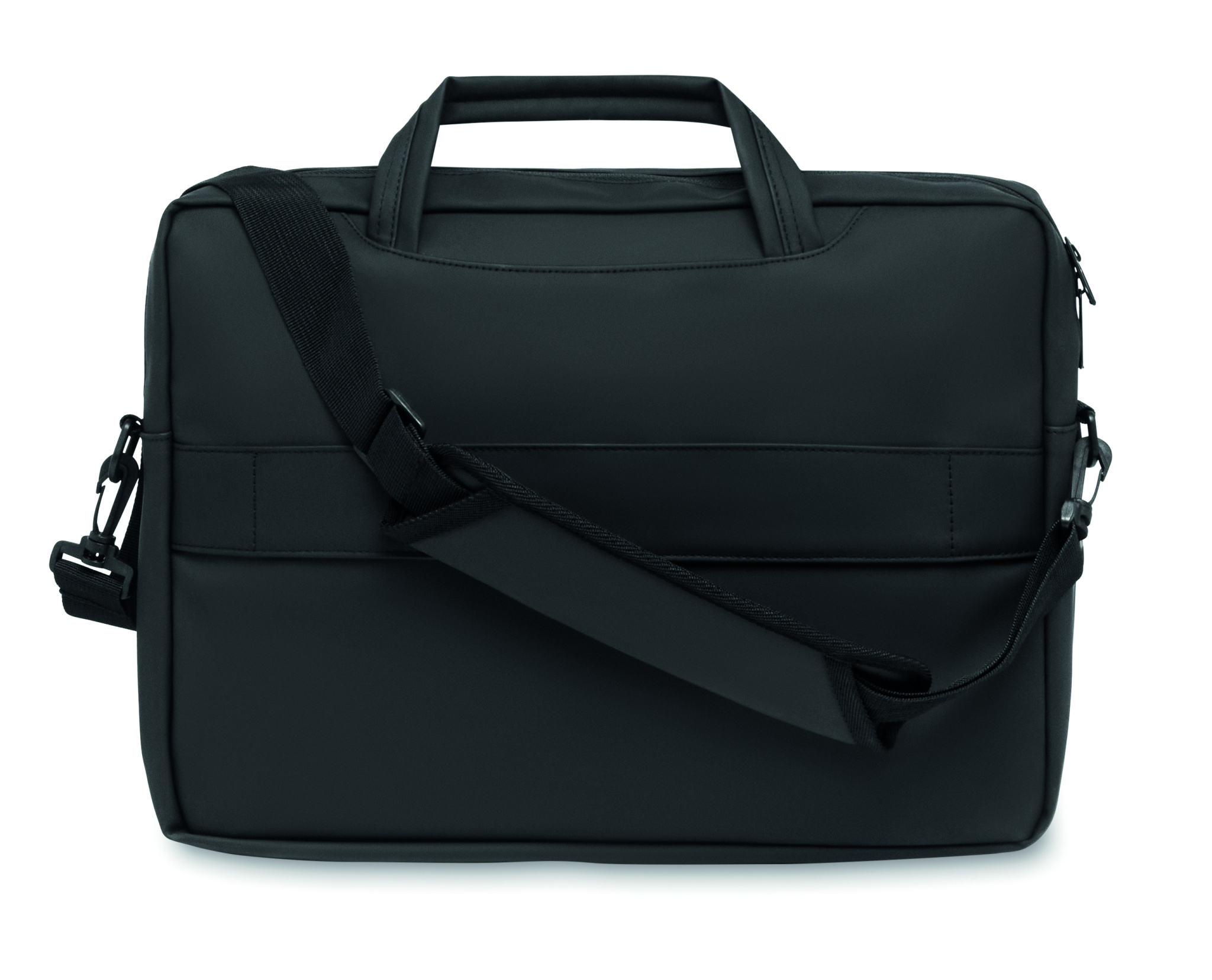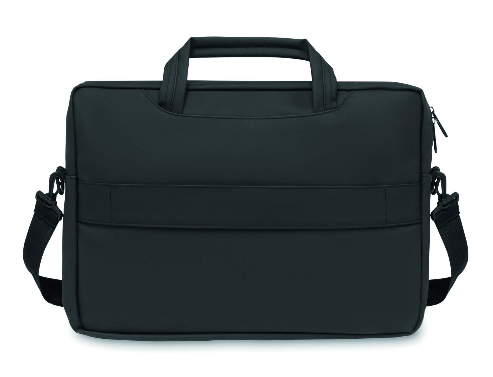 15 tuuman kannettavan tietokoneen asiakirjalaukku pehmeää PU:ta, pehmustettu takaosa. Yksi pehmustettu päälokero kannettavalle tietokoneelle ja vetoketjullinen etutasku useilla osastoilla. 210D RPET polyesterivuori. 2 kahvaa ja yksi säädettävä ja irrotettava olkahihna suojalla ja vaununpidin takana.