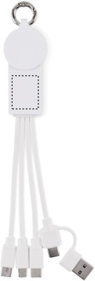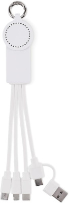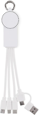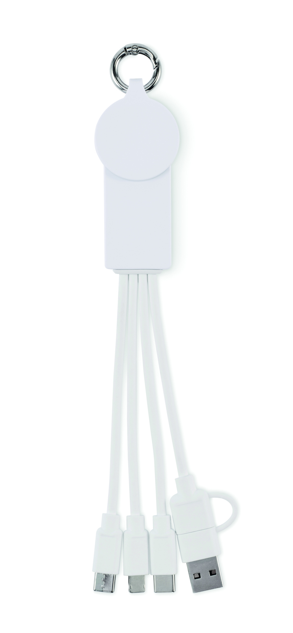 Avaimenperä latauskaapelilla, jonka tulo: 2-in-1 tyyppi-C ja tyyppi-A. Lähtö: (Samsung® ja Apple®), 2 x C-tyyppi ja micro-B (2 in 1 tappi). Kaapeli valmistettu kierrätetystä TPE:stä.
