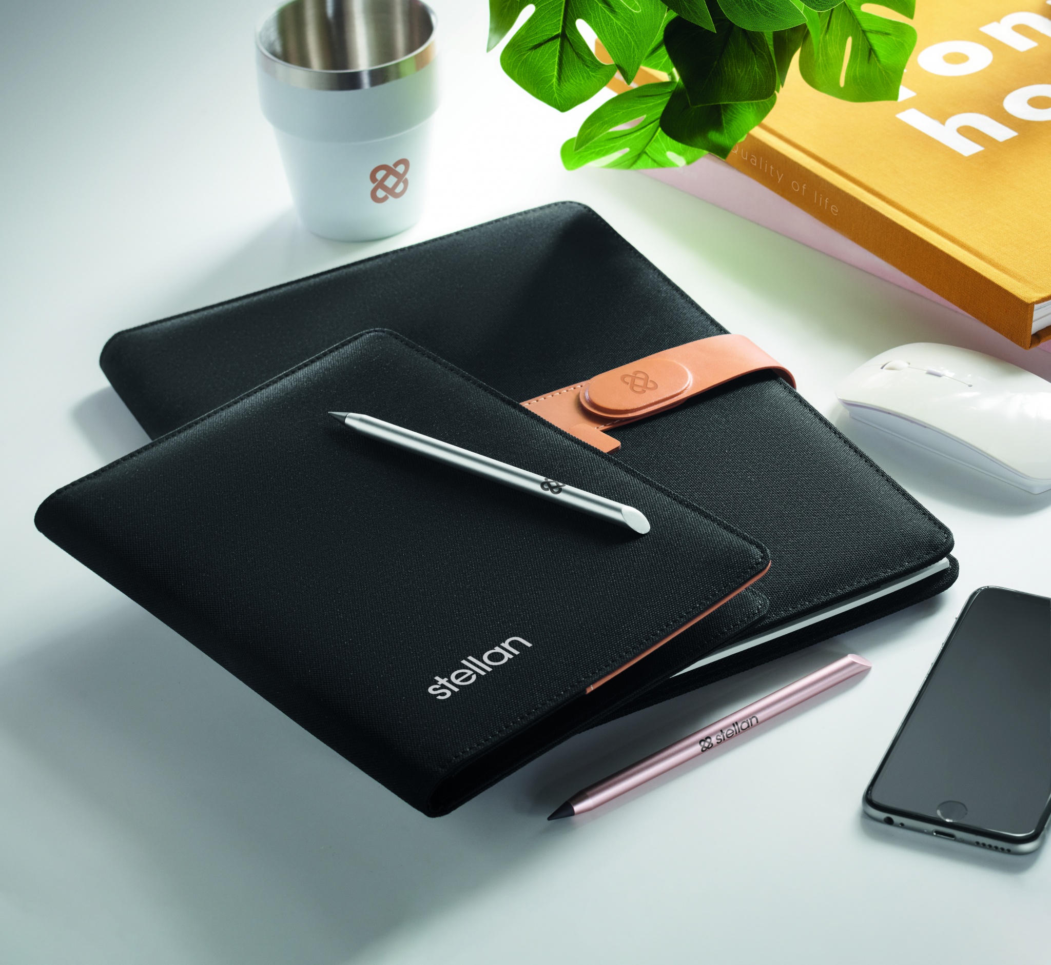 A4-salkku RPET-materiaalista, jossa on keinonahkaisia yksityiskohtia. Uudelleentäytettävä A4-muistilista. 30 viivoitettua sivua kierrätyspaperista. Kynäteline. 4 korttipidikettä, 3 pientä taskua ja yksi iso lokero. Magneettihihnasuljenta.