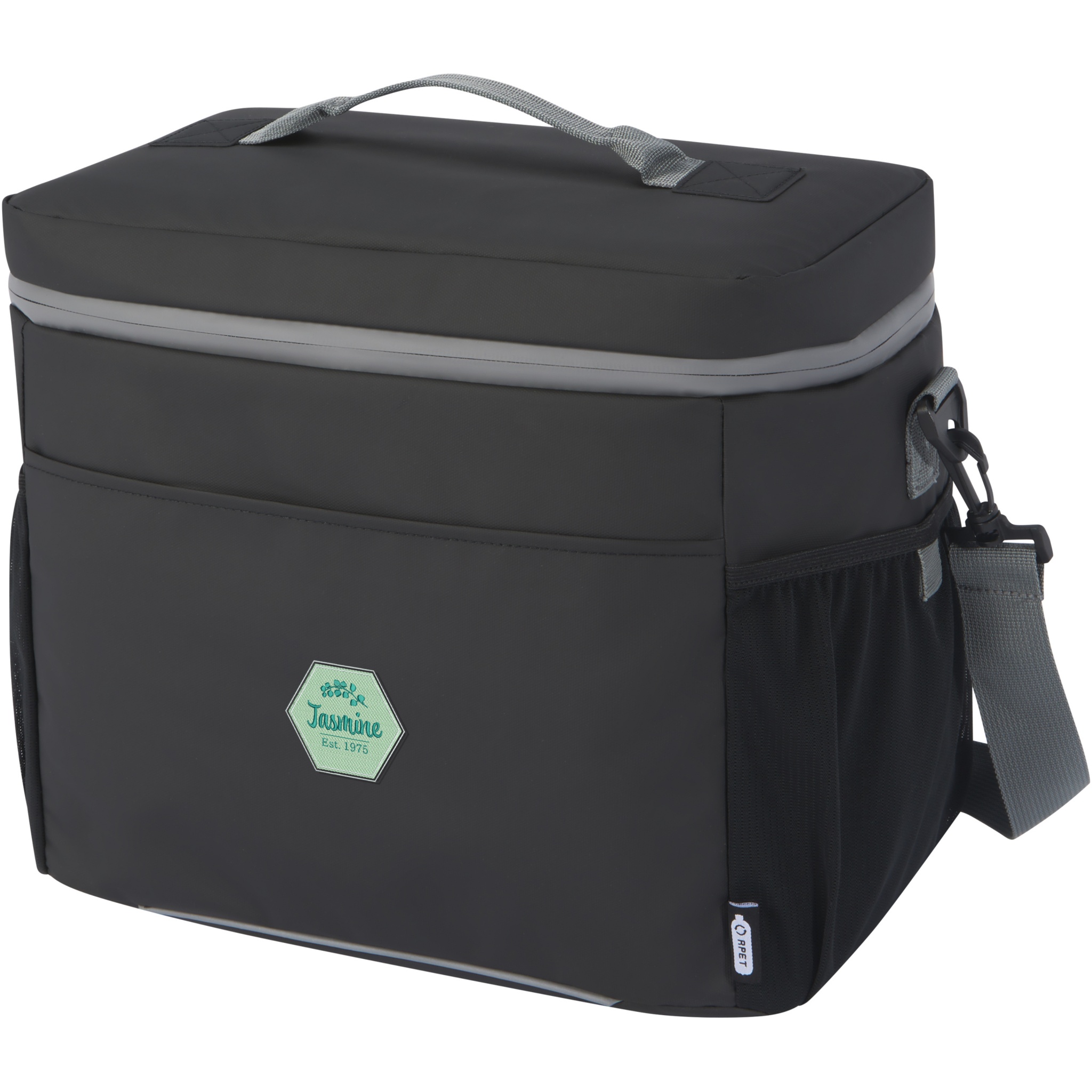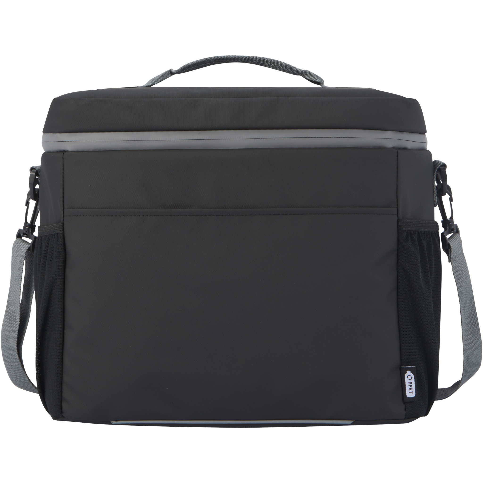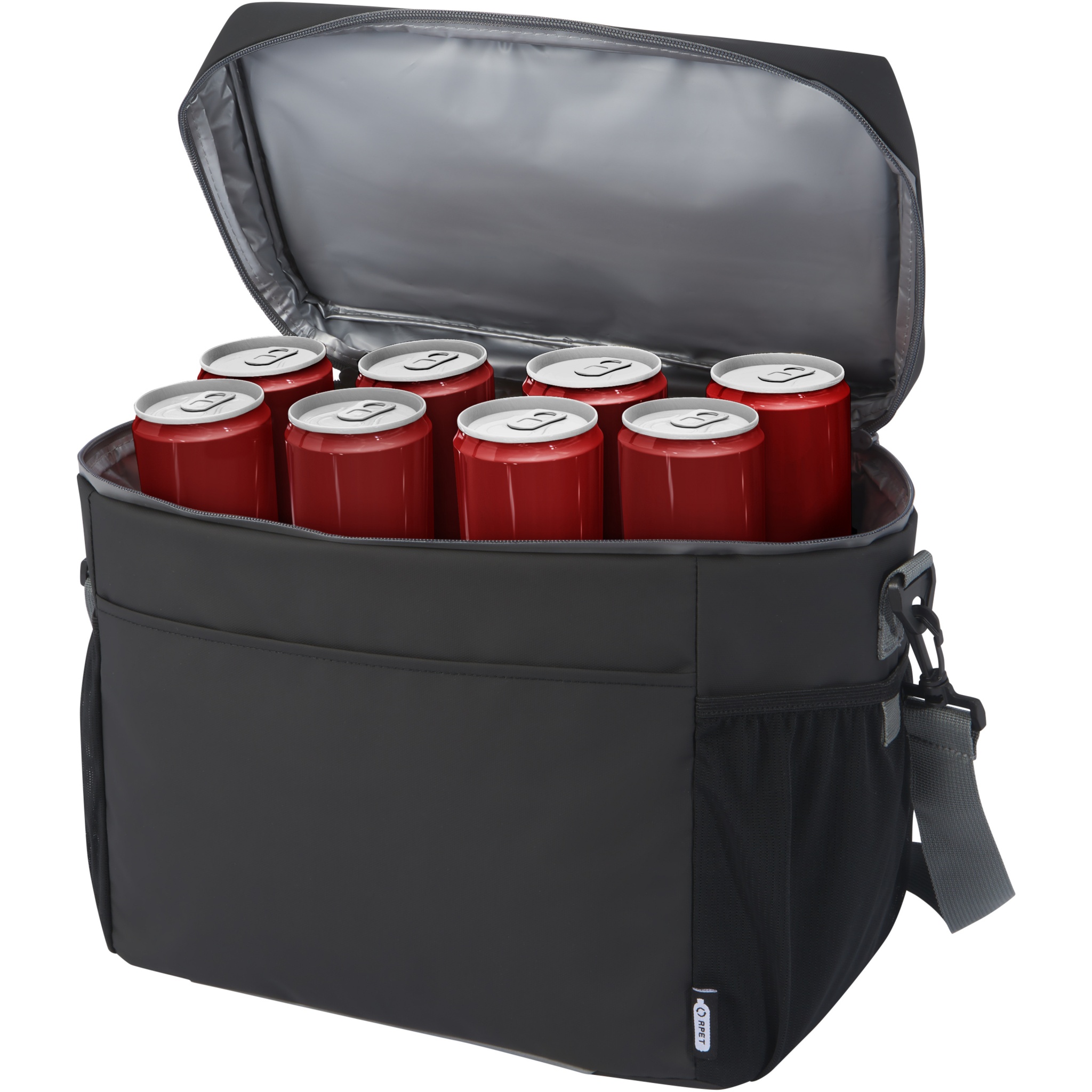 Vedenkestävä 20 tölkin kylmälaukku, jonka osat, mukaan lukien vetoketjut, on valmistettu GRS-sertifioiduista kierrätysmateriaaleista. Kylmälaukussa on tilava vetoketjullinen päälokero, jossa on elintarviketurvallinen paksu PEVA- ja vaahtoeriste. Pitää juomat ja virvokkeet kylminä tuntien ajan. 2 verkkotaskua ja yksi avoin etutasku lisätilaa varten. Kantohihnan ja säädettävän ja pehmustetun olkahihnan ansiosta laukkua on mukava kantaa. Laukun kangas, vuori, nauha ja vetoketjut on valmistettu GRS-kierrätysmateriaaleista. Tilavuus: 22 litraa. PVC-vapaa.