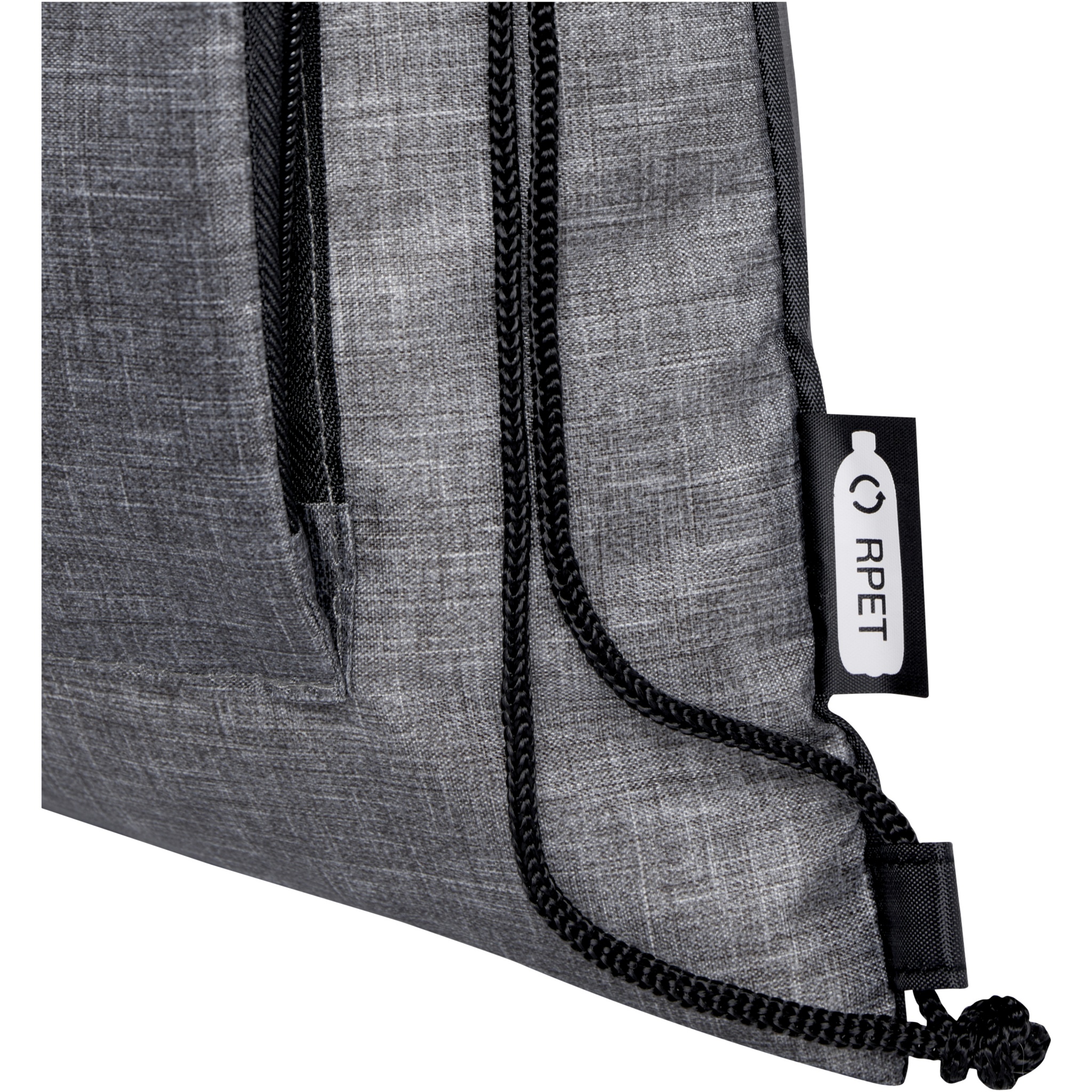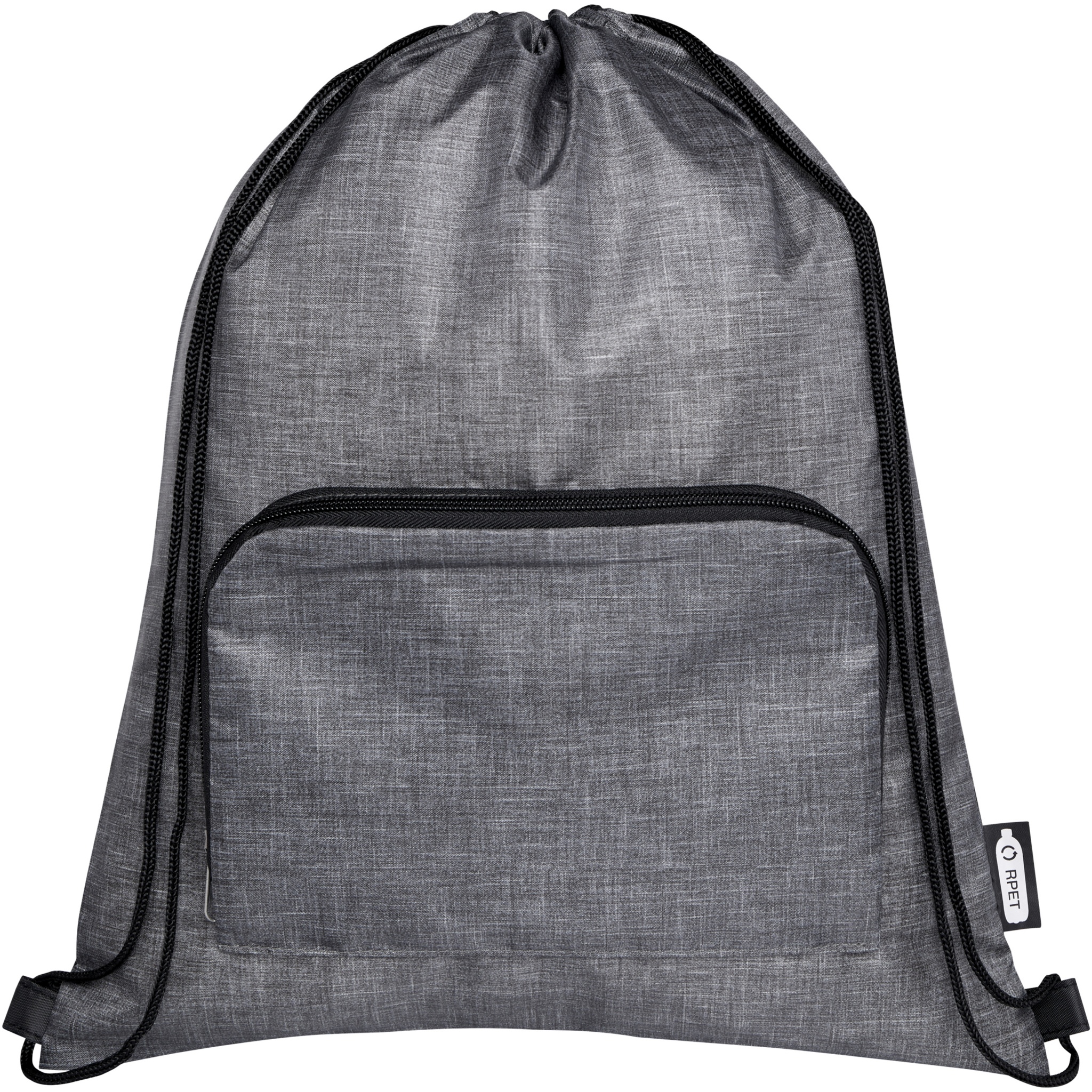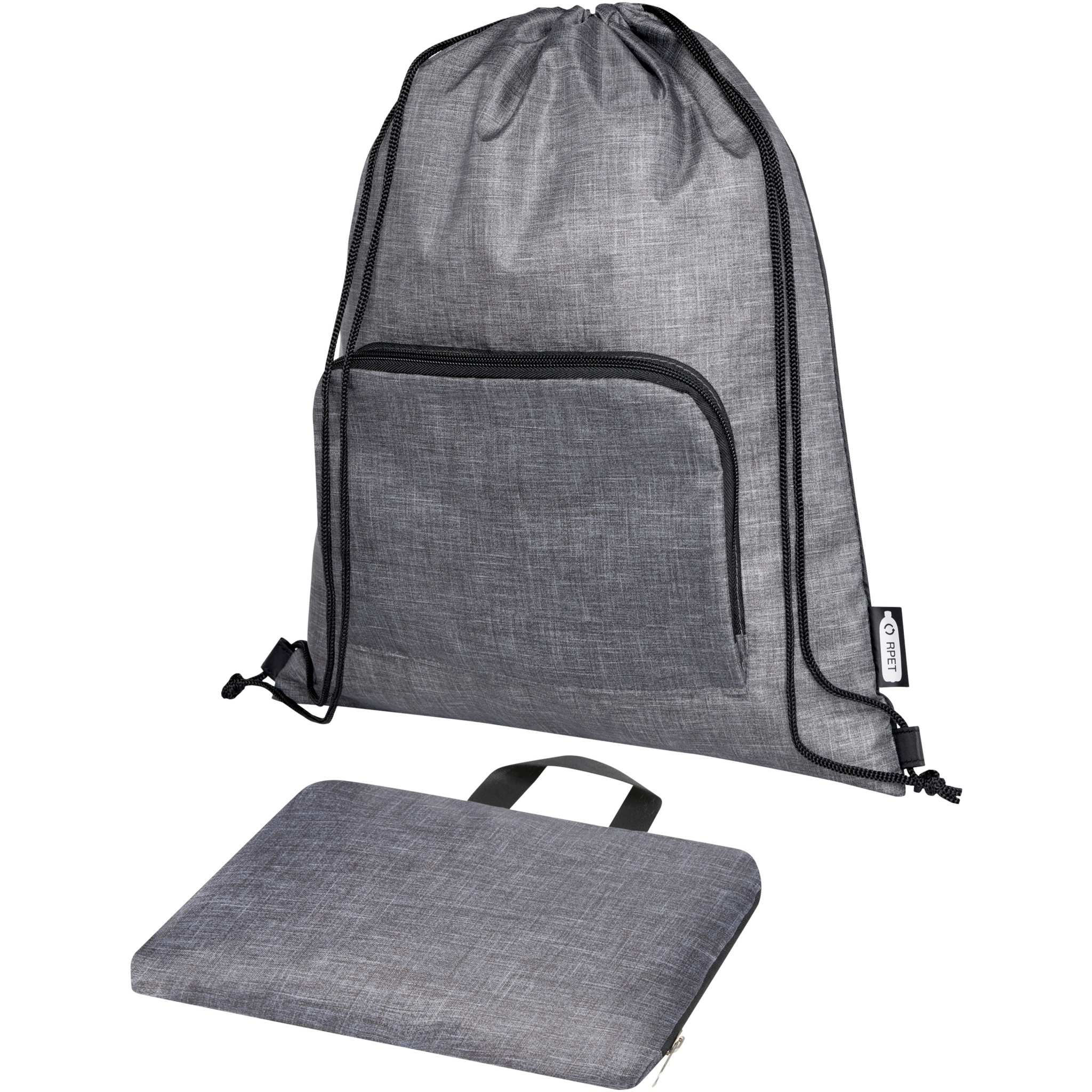 Ash taittuva kierrätetty kiristysnyörillinen kassi, jossa on kiristysnyörillinen päälokero ja vetoketjullinen etutasku, johon kassi voidaan helposti taittaa kuljetusta ja säilytystä varten.