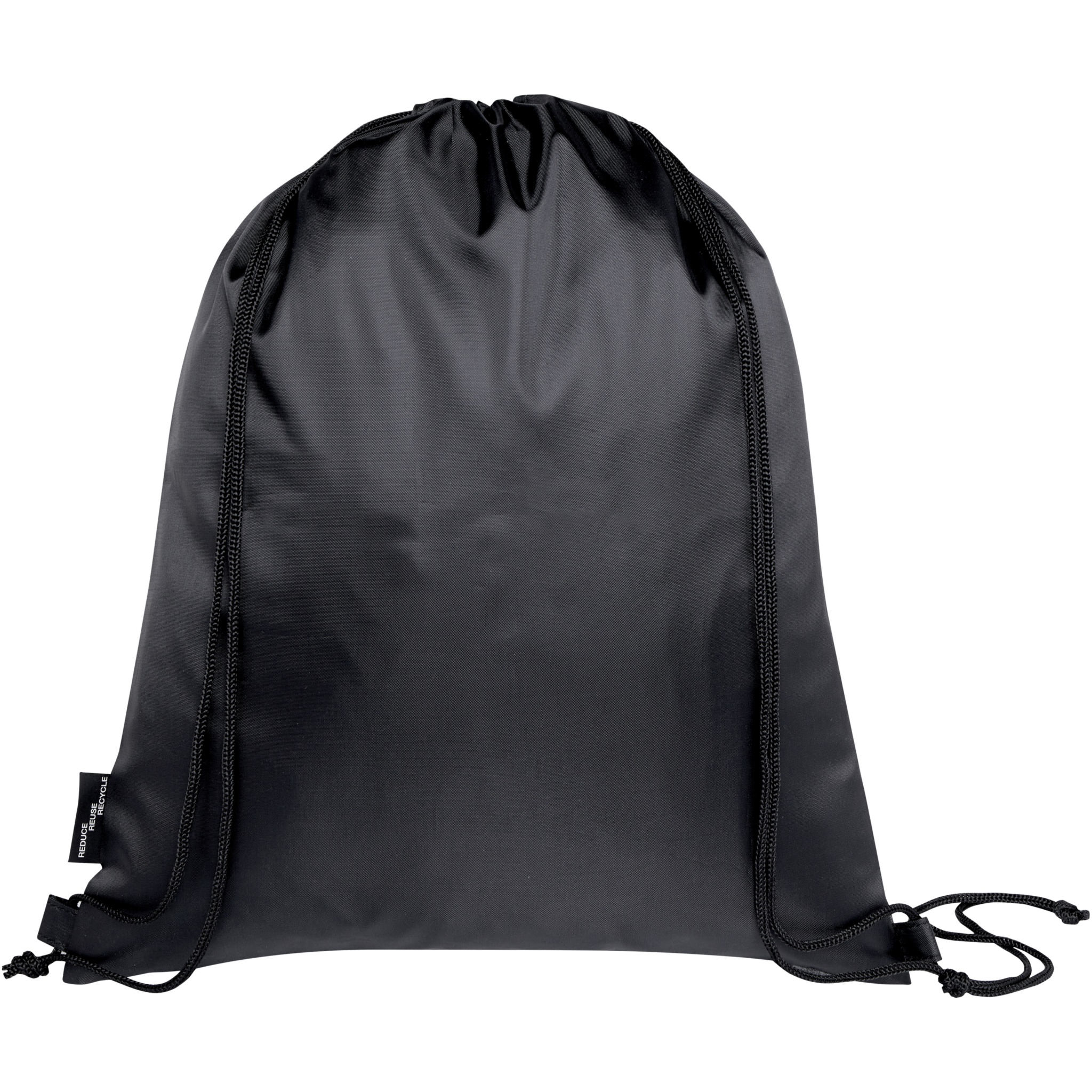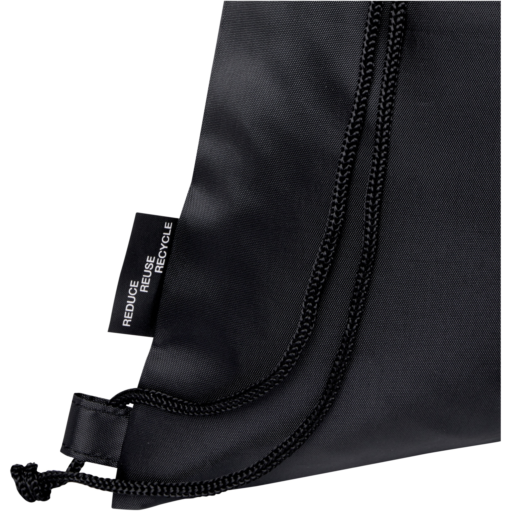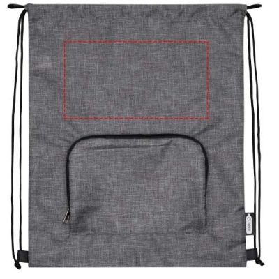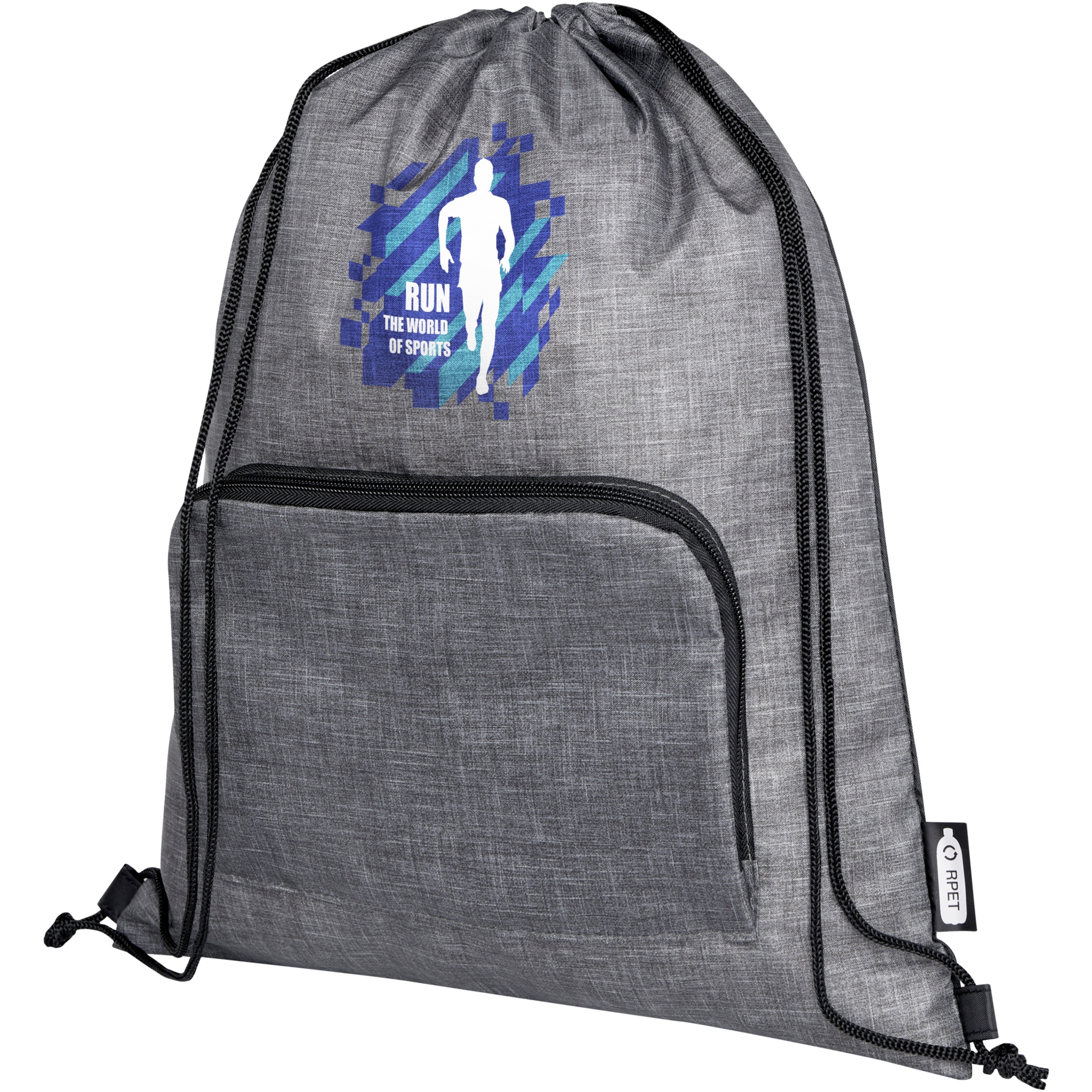 Ash taittuva kierrätetty kiristysnyörillinen kassi, jossa on kiristysnyörillinen päälokero ja vetoketjullinen etutasku, johon kassi voidaan helposti taittaa kuljetusta ja säilytystä varten.