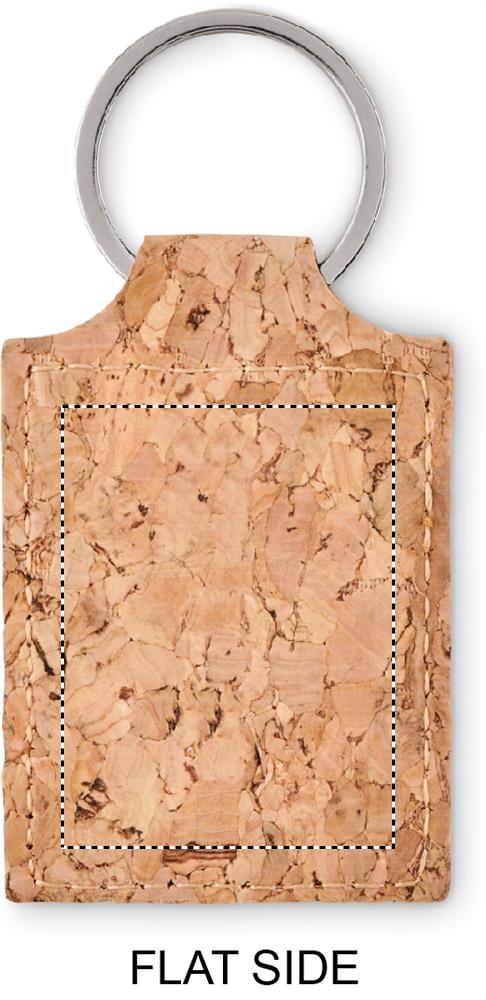 Suorakulmainen korkista tehty avaimenperä. Korkki on luonnonmateriaali, strukturaalinen laatu ja pinnan huokoisuus voi aiheuttaa eroavaisuuksia tuotteissa painatuksen jälkeen.