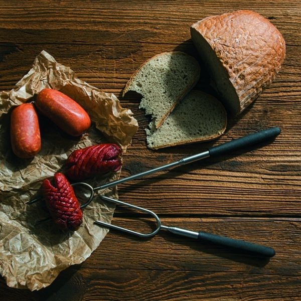 Käytännöllinen sarja kahdesta teleskooppisesta BBQ-haarukasta, jotka on valmistettu ruostumattomasta teräksestä ja PVC-kahvoista, pakattu nylon nylon pussiin.