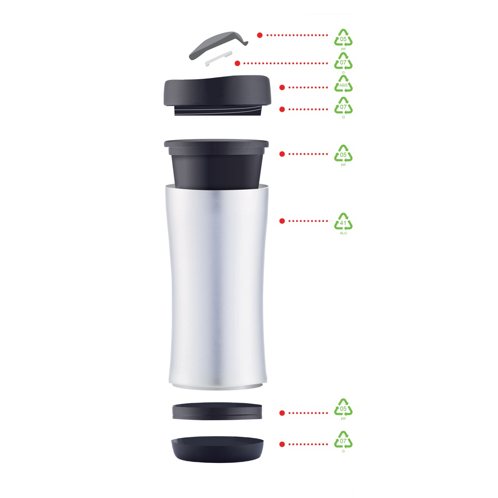 Boom on 225 ml vuotamaton, kaksiseinäinen matkamuki sekä kylmiä että kuumia juomia varten. Muki on suunniteltu purettavaksi kokonaisuudessaan sen käyttöiän päätyttyä kierrätystä varten. Osoita ympäristösitoumuksesi purkamalla ja kierrättämällä jokainen mukin osa puhtaamman planeetan puolesta. Rekisteröity design®