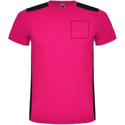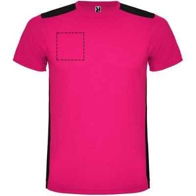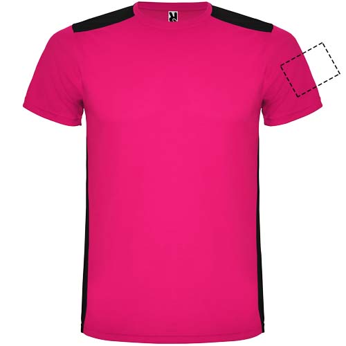 Helposti kuivuva, tekninen ja hengittävä kangas. Pyöreä kaula-aukko. Kahden polyesterikankaan yhdistelmä selässä ja olkapäissä. Bird's eye -kangas edessä ja hengittävä 3D-verkkokangas takana. Kangas, joka on suunniteltu imemään kosteutta. Sivuilla ja olkapäillä koristeellinen siksak-selkätikki. Selkäosa hieman pidempi. Irrotettava etiketti.